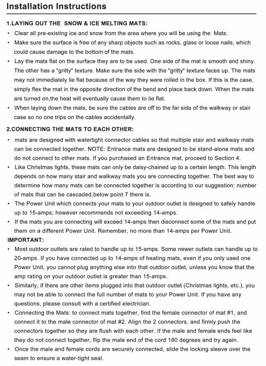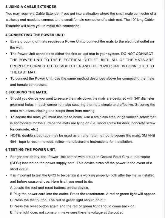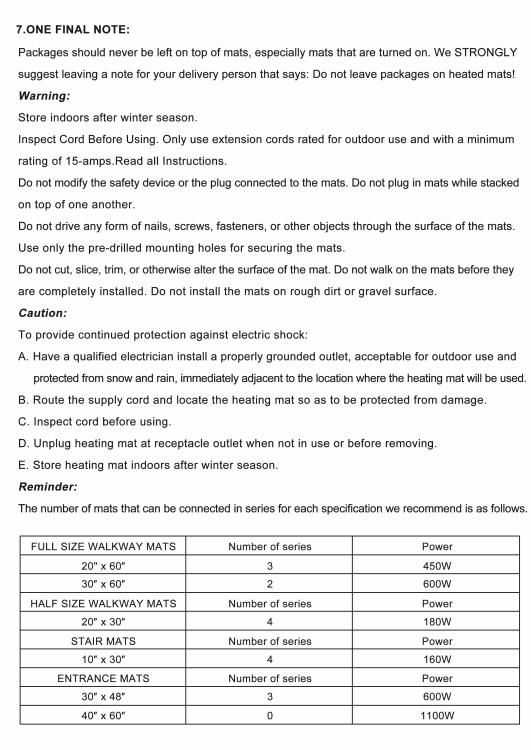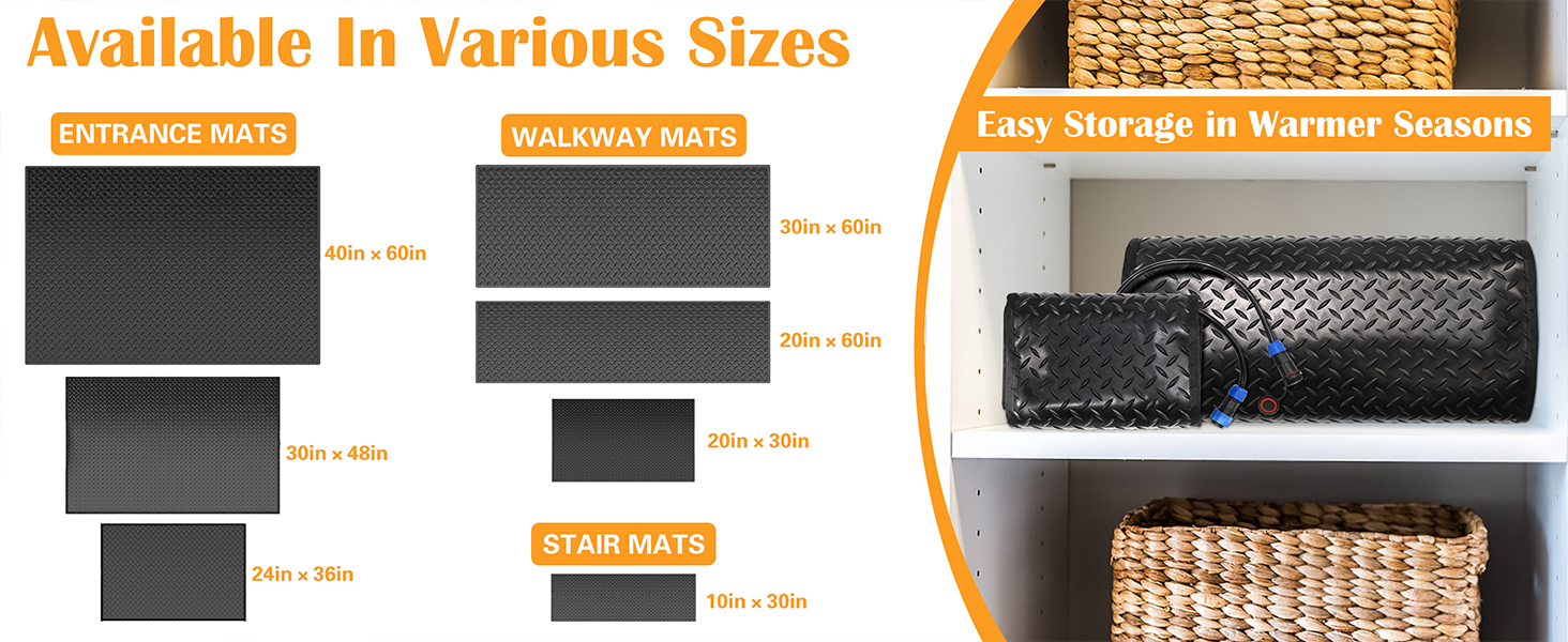 Product Information: 9 Sizes for choice: 10 x 30inch、20 x 30inch、 24 x 36inch、 20 x 60 inch、30 x 60 inch、 30 x 48 inch、40 x 60 inch snow melting mats. And We also have the Extra Long Size:24 inch x 10 FT and 36 in x 5 FT, It will clean your walkways or entrances quickly at a jaw-dropping snow-melting rate of 3 in/h and heating temperatures of 149℉. Perfect for most surfaces like concrete, asphalt, stone, and wood decks. Make this winter pain-free.