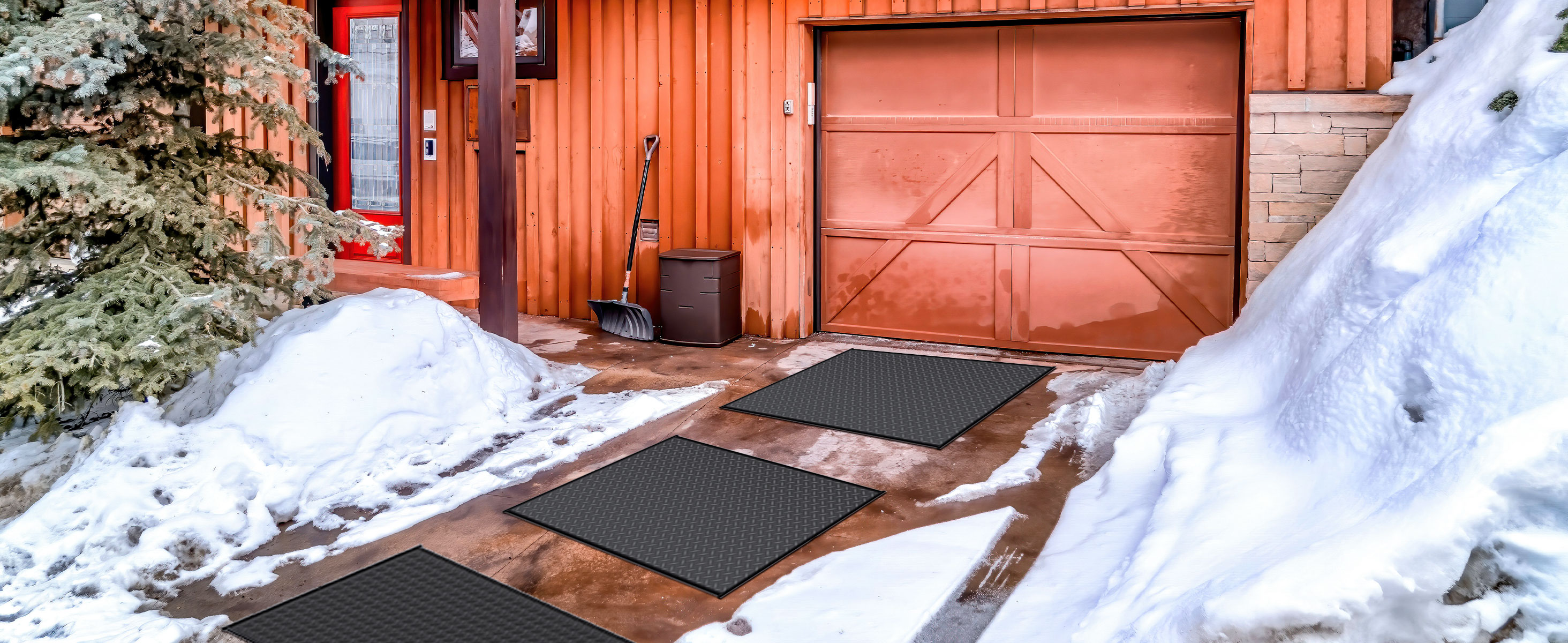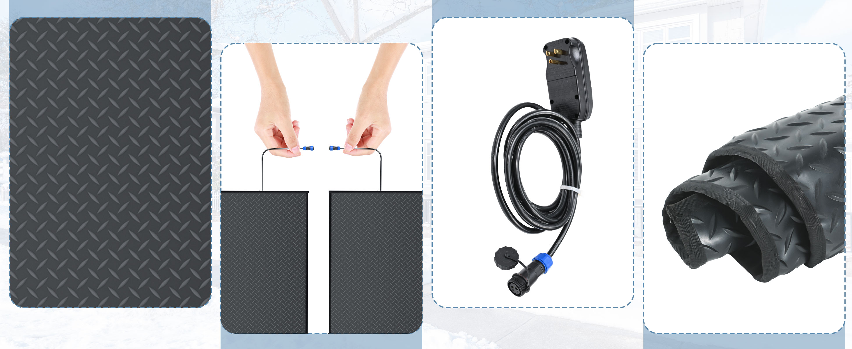Rather than waste time hurting your back and spreading salt on snow by yourself, why not make life easier, and choose our 10 x 30inch、20 x 30inch、 24 x 36inch、 20 x 60 inch、30 x 60 inch、 30 x 48 inch、40 x 60 inch snow melting mats. And We also have the Extra Long Size:24 inch x 10 FT and 36 in x 5 FT snow melting mats instead? It will clean your walkways or entrances quickly at a jaw-dropping snow-melting rate of 3 in/h and heating temperatures of 149℉. Our heated outdoor mats are made of premium rubber and heating wire. They are wear-proof, waterproof, pro-environment, odorless, and durable enough to be left outside to endure harsh weather all winter long. The textured surface provides excellent traction. Our ice melting mats come with a 10 ft power cord and a leakage-proof plug with a working status indicator. Just lay the snow mat down and plug it into a 110V socket. You can use it independently or interconnected with other mats (up to 1800 W). Why slip and slide when you can walk confidently this winter? This snow melt mats can be used indoors and outdoors, at park entrances, in garages, hotel entrances, supermarket entrances, and industrial use. Our outdoor heated mat for walkway is provided for all types of applications, including your roof, stairs, grass, floor, etc. No more climbing on a ladder to shovel your roof.