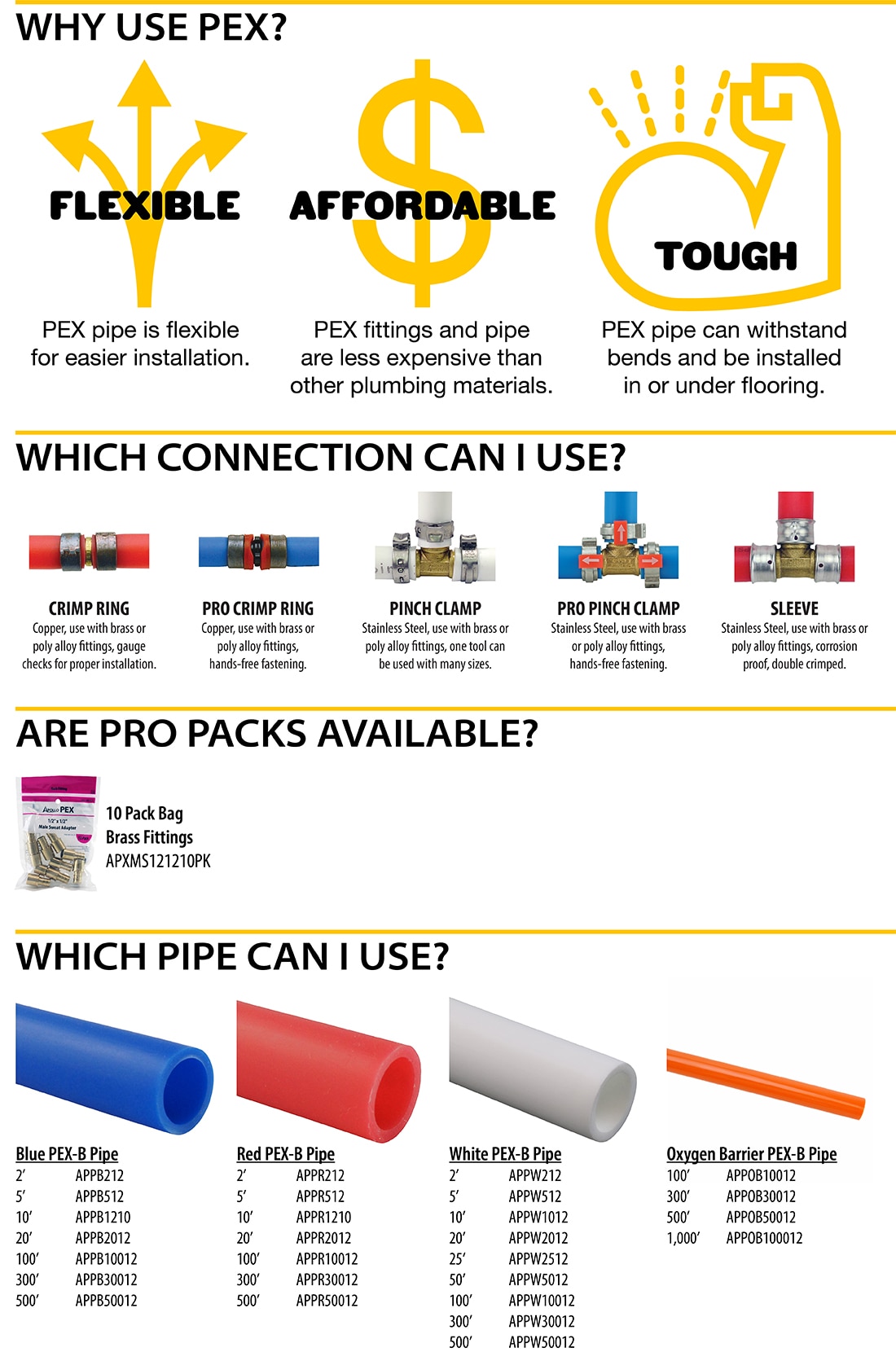 The ApolloPEX 1/2 in. Brass PEX Barb x Male Copper Sweat Adapter (10-Pack) is simple to install and is designed as an economical solution for the transtion from copper tubing to PEX tubing. ApolloPEX barb fittings are a key component of the most economical potable water piping systems. Also capable of integration into hydronic heating systems, ApolloPEX adapters can be secured into place using copper crimps, stainless steel pinch clamps or stainless steel crimp sleeves (all sold separately). The ApolloPEX system is a comprehensive piping system comprised of brass fittings, poly alloy fittings, manifolds, valves, fasteners, tools and tubing designed for implementation in water delivery systems, simple or complex.