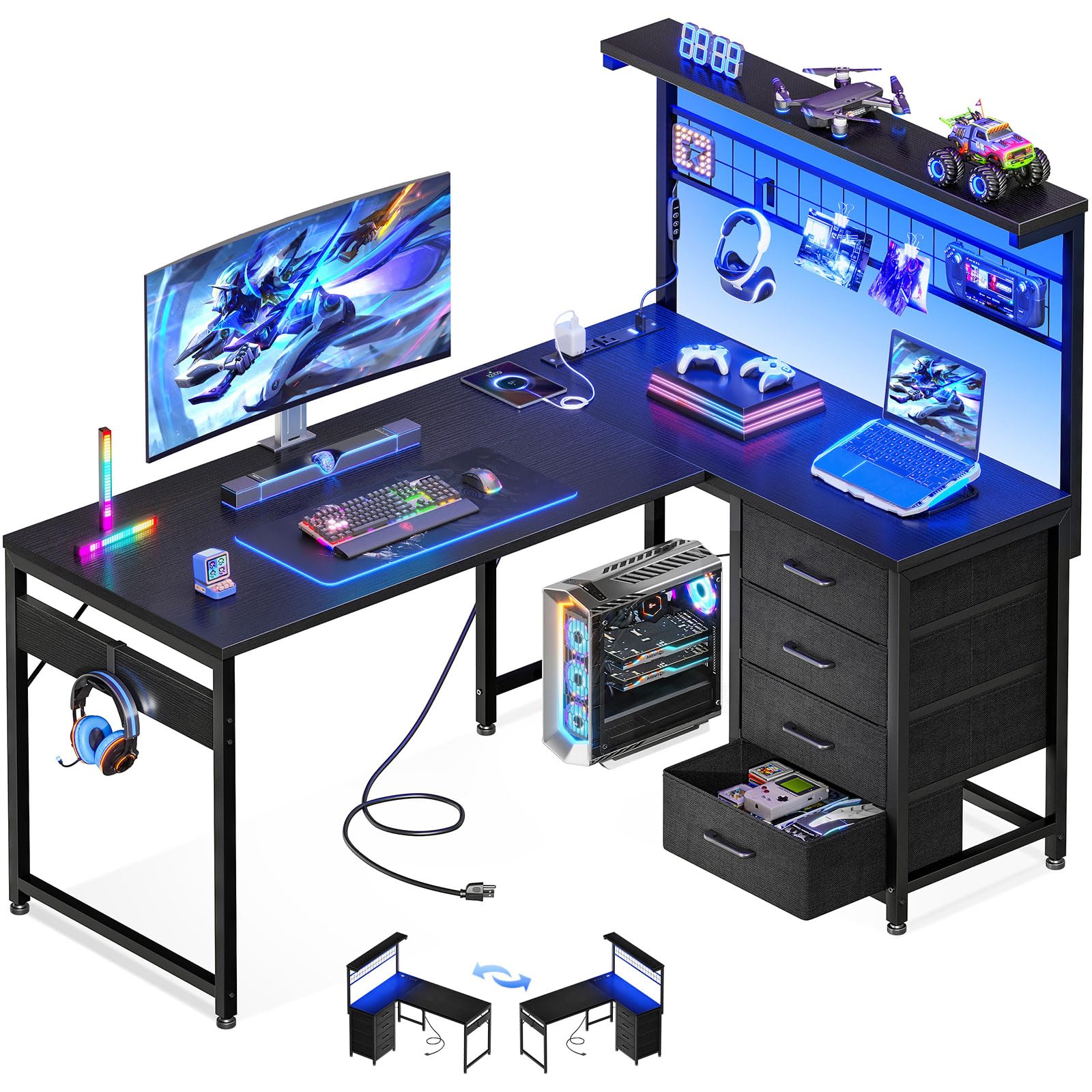 【Reversible L Shape Desk】This L shaped desk comes with storage shelves, drawers, grid pegboard, power outlet, light strip and headphone hook. The L desk is reversible and the top hutch can be fixed on the left or right side according to your needs, maximizing your limited space and ideal for corner spaces. A great choice for home office, game, office, studio and living room.