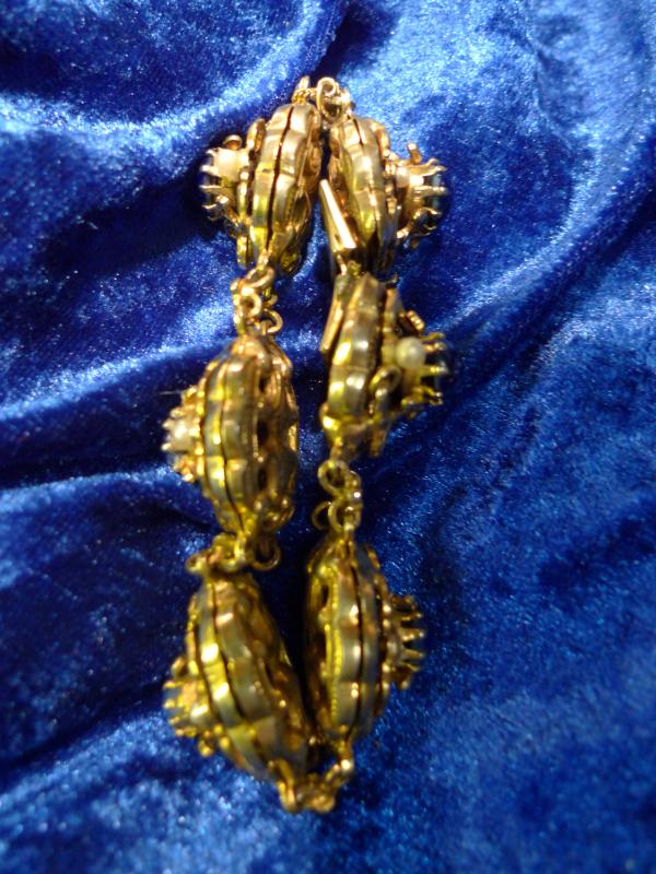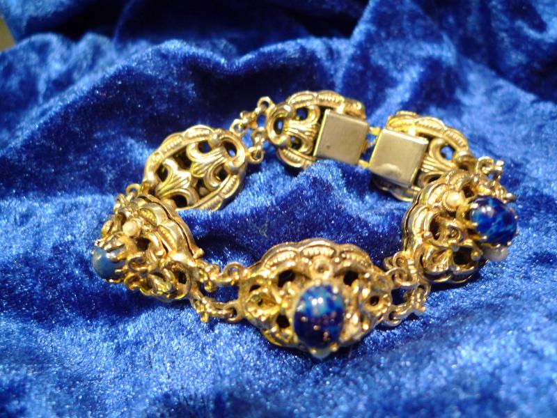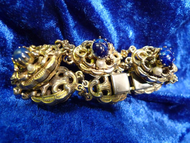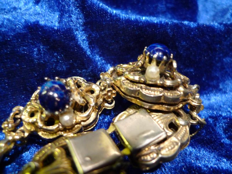 Bracelet noble et vieux. Gilded Silver (je ne trouve pas de tampon, vérifié par des professionnels, au moins 800 argent), beau et finement travaillé, vieux travail manuel. Décoré, y compris avec de grandes pierres bleues (lapis lazuli, une balle a probablement été remplacée, est un peu plus petite et une autre, la pierre bleue) et les petites perles, est maintenue ensemble par une chaîne de sécurité fine. Je ne suis pas au courant de l' Vieux exact ( vieux ! Quel vieux ? ). En raison de l'âge, du bon état (certains des petits. Les perles sont manquantes, voir les photos). Dimensions: env. 19 cm de long, 1,8 cm de large, 1,5 cm, 40,4 g de lourd. Bracelet noble, vieux! Cet article est exclu de l'ordonnance générale de sécurité des produits 2023/988 (GPSR). Parce que ce sont soit des sous-pro