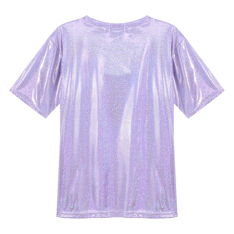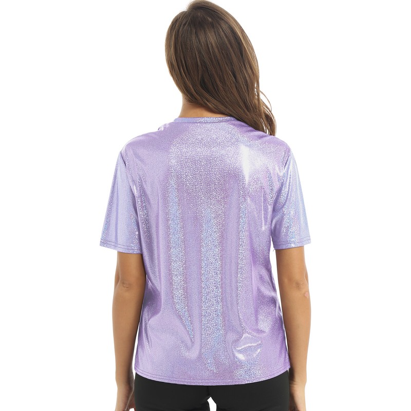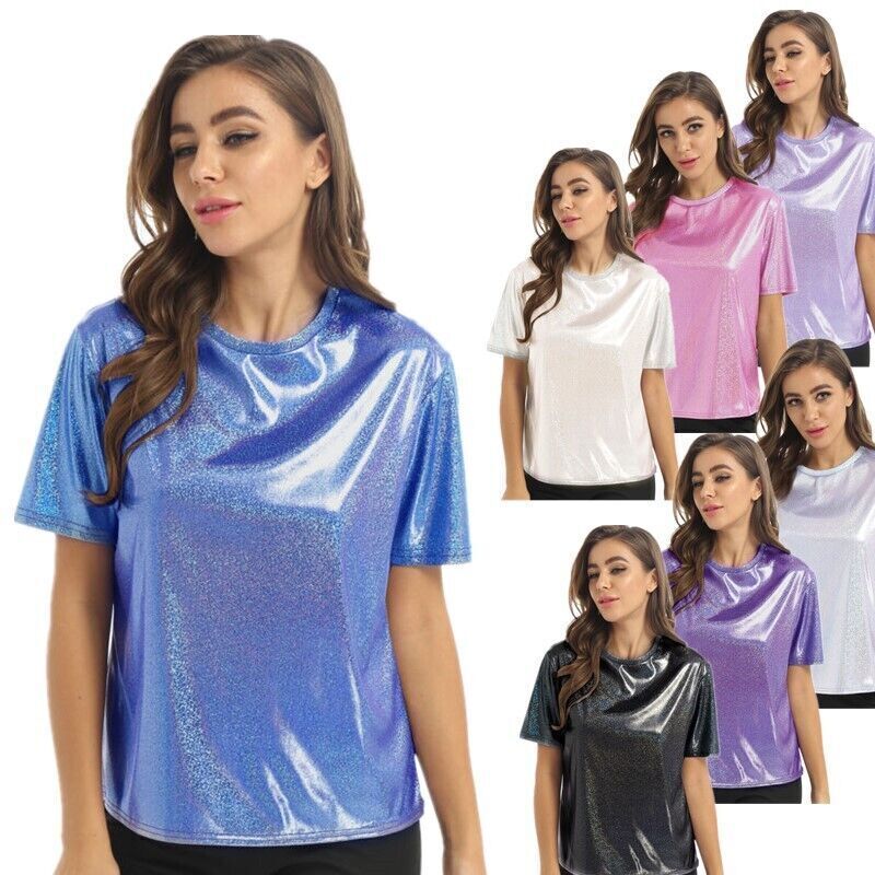 Womens Fashion Shiny Short Sleeve T-Shirt Casual Sparkling Round Neck Tops.