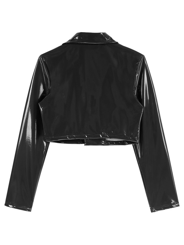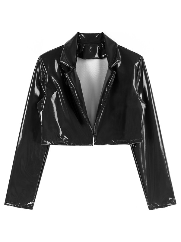 The patent leather jacket can be paired with crop top, tank top, jeans or leggings, creating a cool motorcycle look.