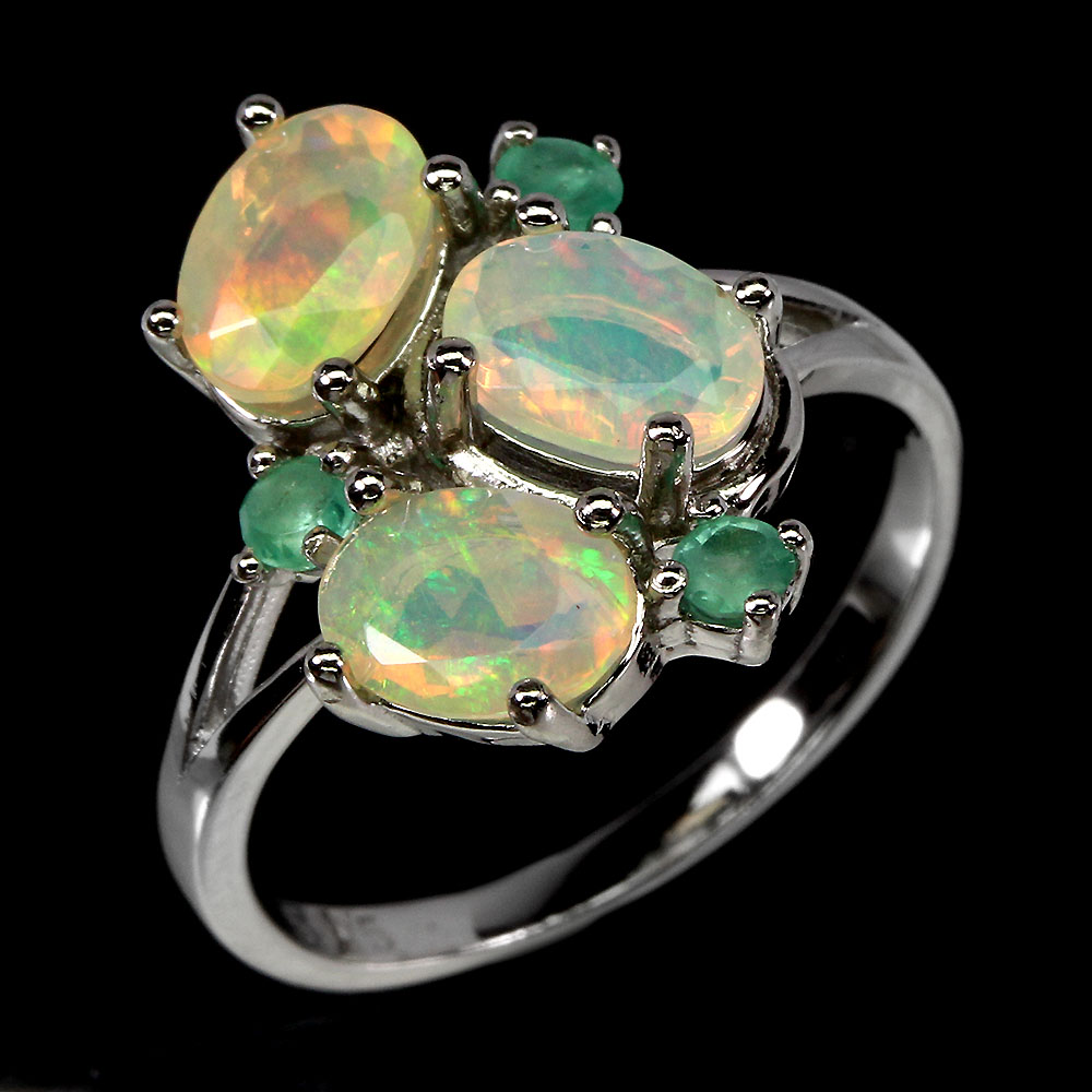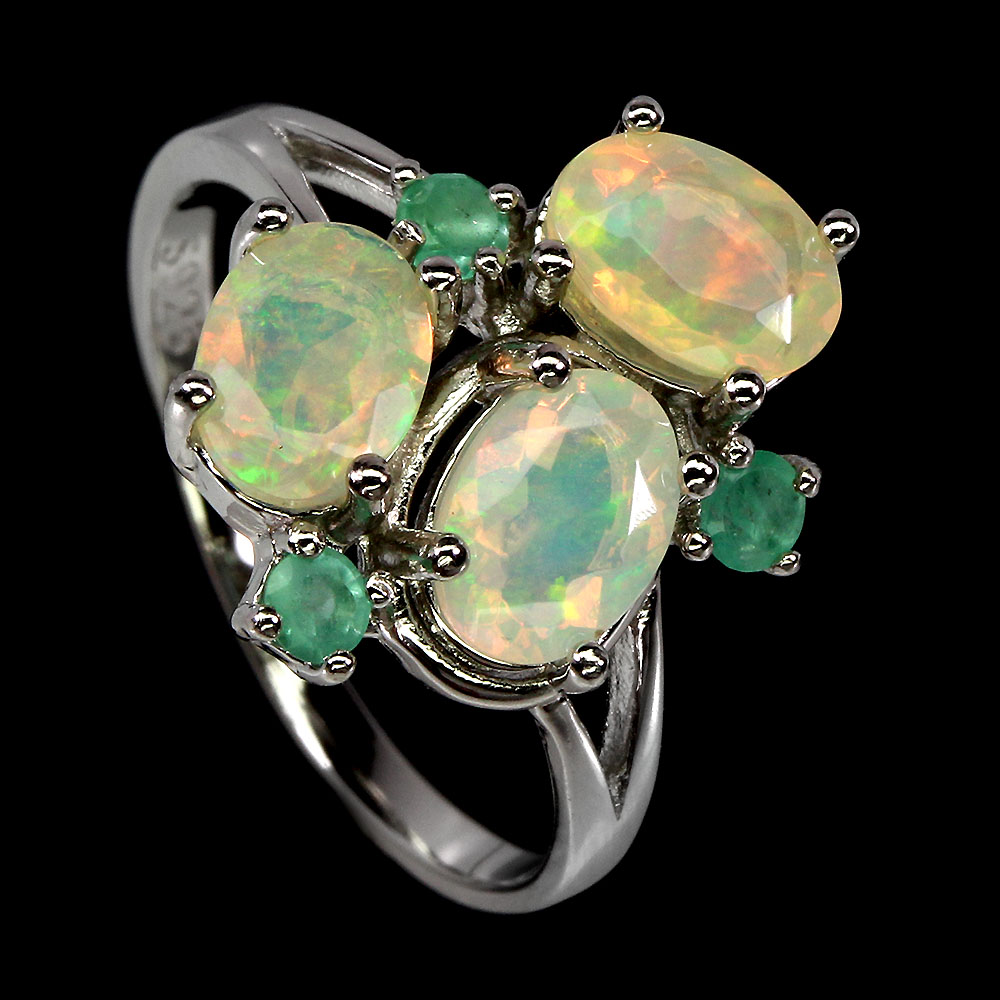 Unheated Oval Fire Opal Rainbow 7x5mm Green Emerald 925 Sterling Silver Ring