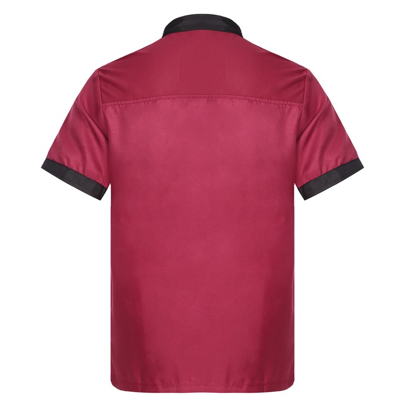 Unisex short sleeve chef coat, cross-over collar, contrast color detail, the upper back is designed with breathable mesh patchwork panel.