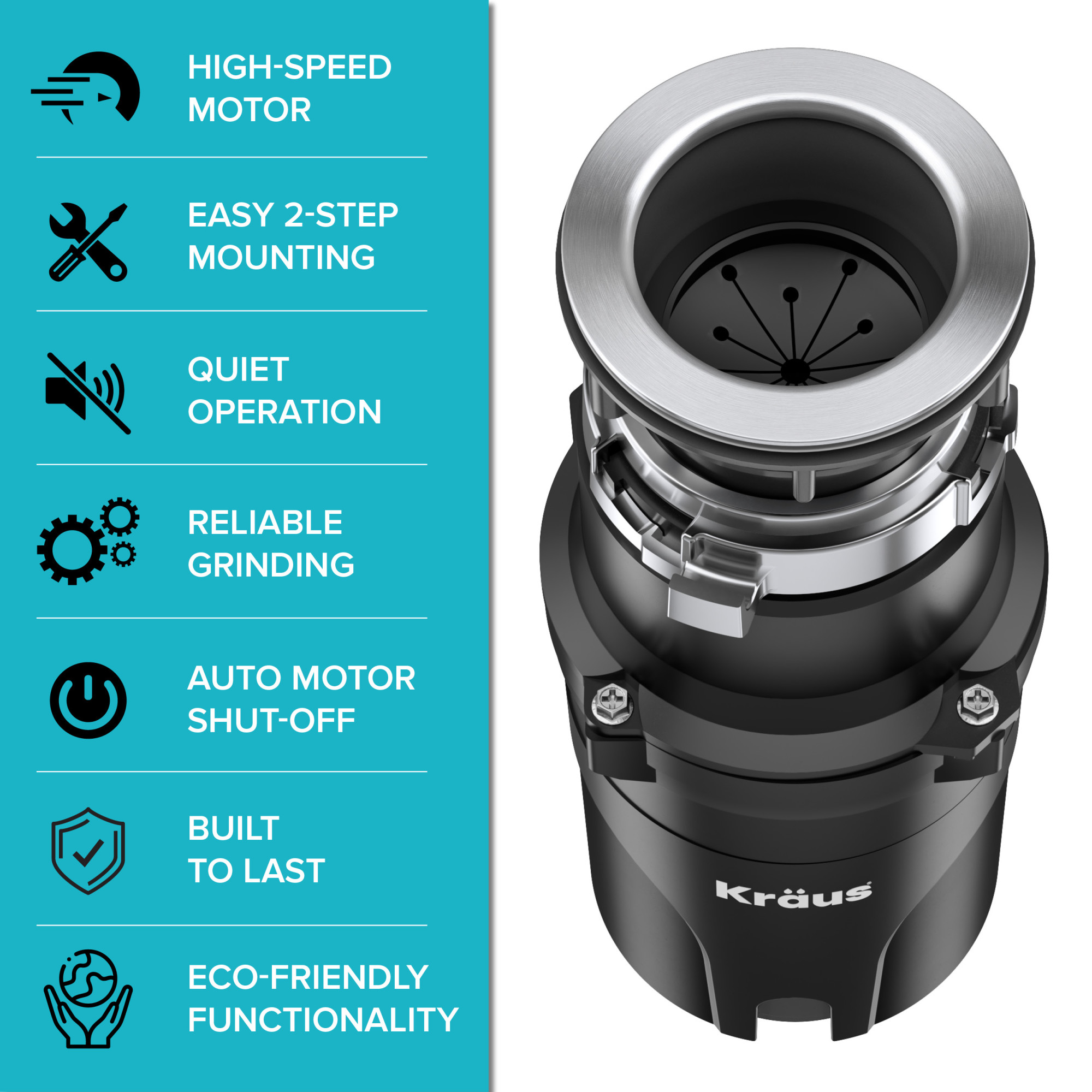 Get rid of food waste in seconds with the KRAUS WasteGuard Continuous Feed Garbage Disposal for Kitchen Sinks. Featuring a heavy-duty MagnaGrind 3800 RPM 1/2 Horsepower permanent magnet motor that provides instant power, this disposal ensures faster operation than traditional induction motors for reliable grinding of everyday food scraps. This disposal is perfect for homeowners who use their kitchen regularly and want to keep cleanup simple. The continuous-feed garbage disposal can shred large quantities of food waste, eliminating the need to grind in batches. This model packs all the features you need into a compact body, saving space in the base cabinet. Designed to grind waste into small particles and get rid of it through the sink drain, the disposal helps reduce the amount of food waste and garbage bags going to landfills. Motor-saving shut-off technology instantly cuts power to the disposal in case of blockage to help prevent damage to the unit. Built for long-lasting use with stainless steel grinding components and durable ABS housing. Anti-vibration mounting system and permanent magnet motor with low decibel output ensure quiet operation. The universal design fits standard US plumbing and sinks with 3 1/2” drain openings. EZLock quick-connect assembly locks into place with a turn of the hand for easy installation. Stopper doubles as plunger to push food scraps into the disposal. Installation-ready kit includes power cord, flange, drain and dishwasher connections