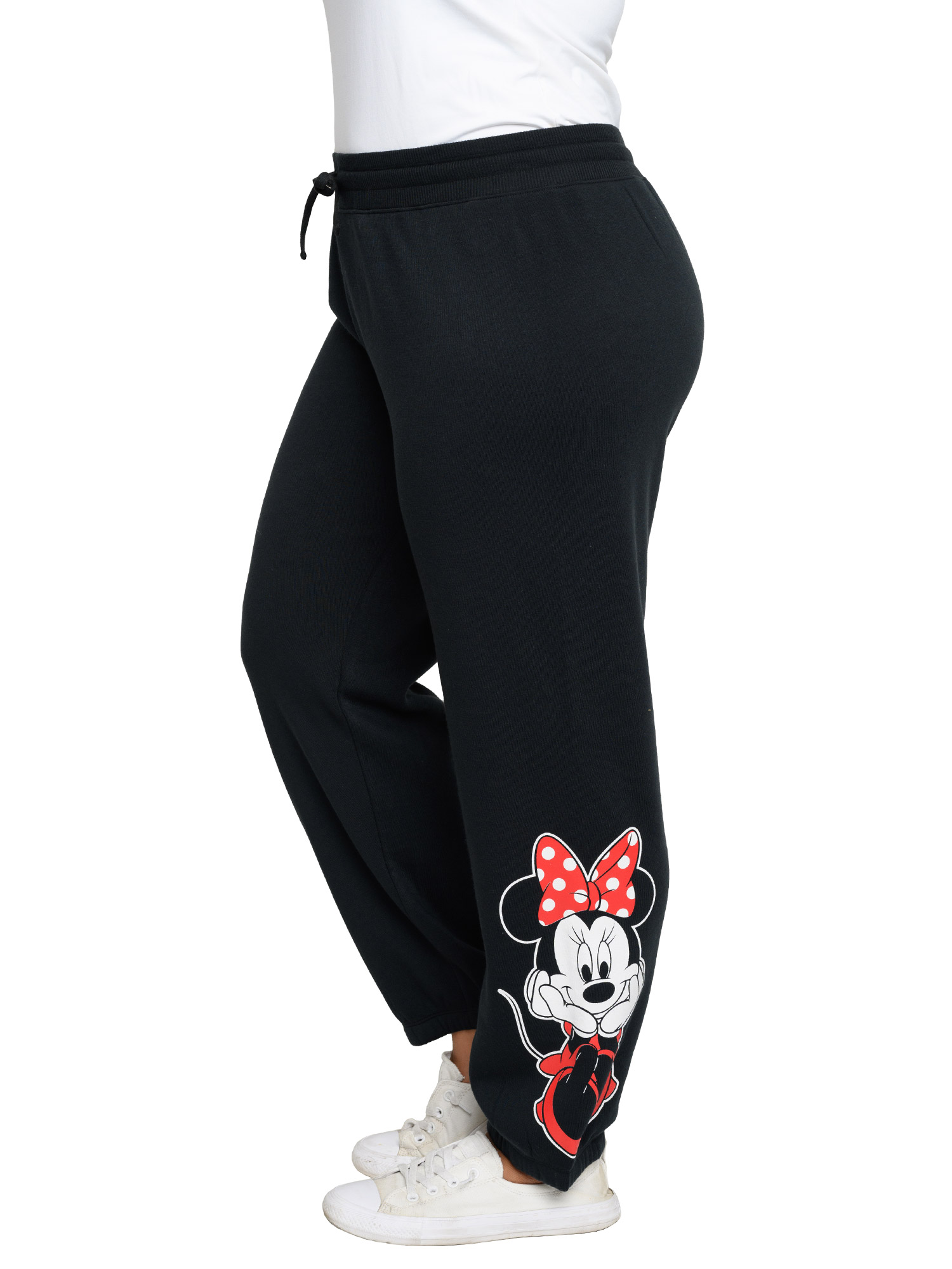 - Jogger pants features a bright graphic print of Minnie Mouse sitting on the left leg.