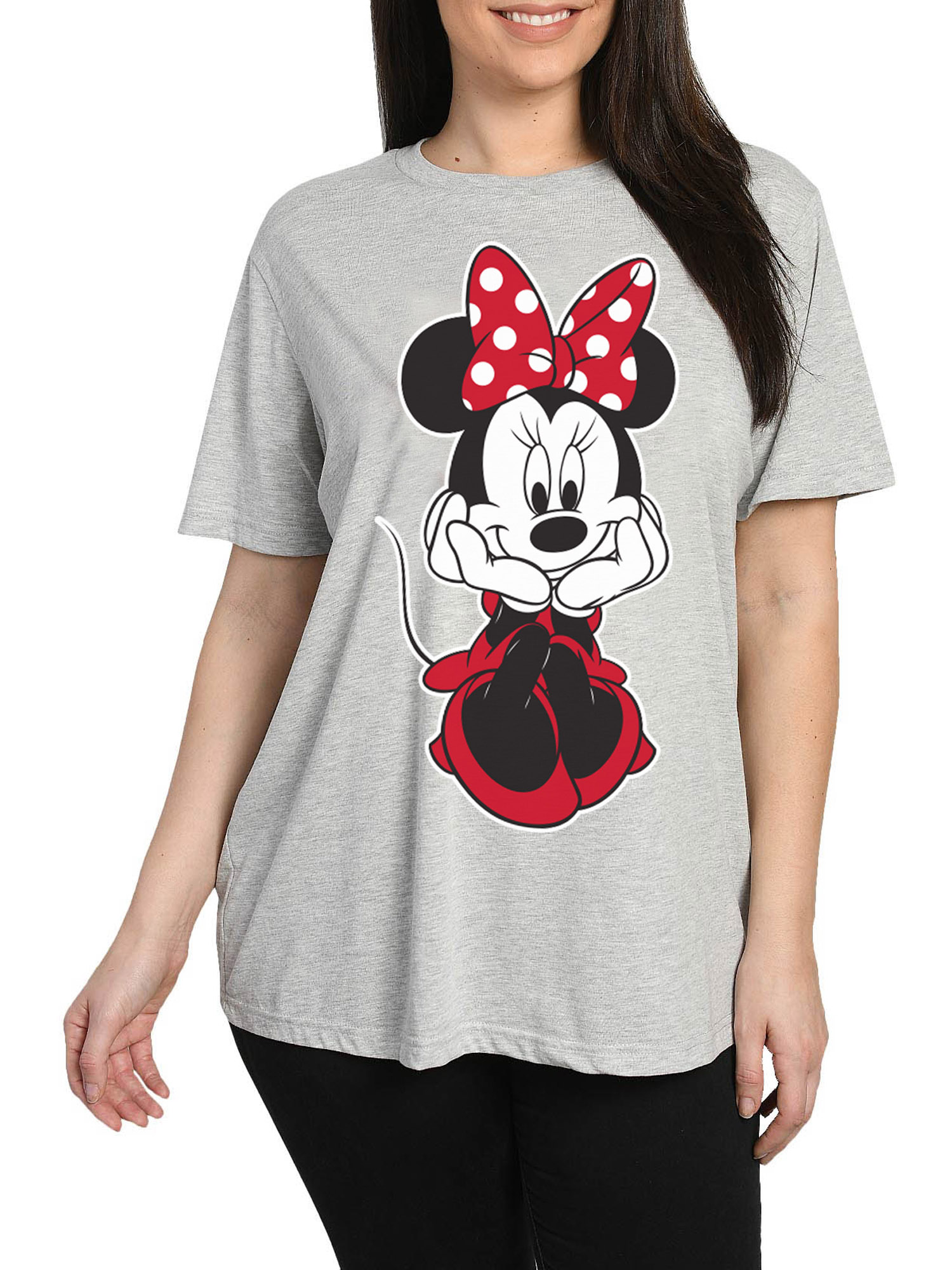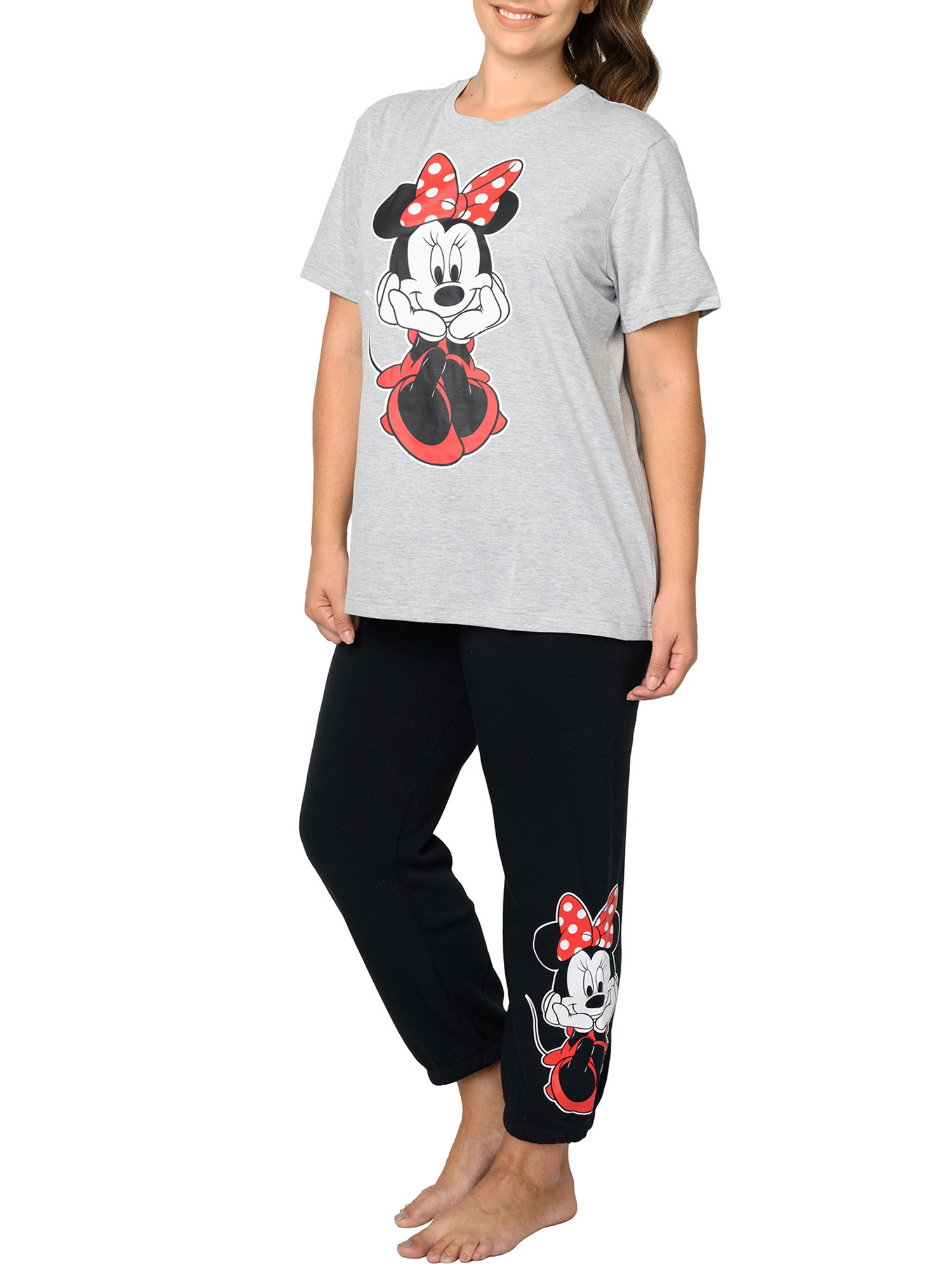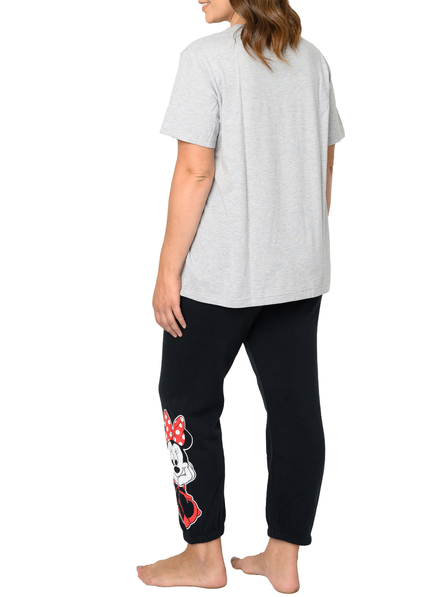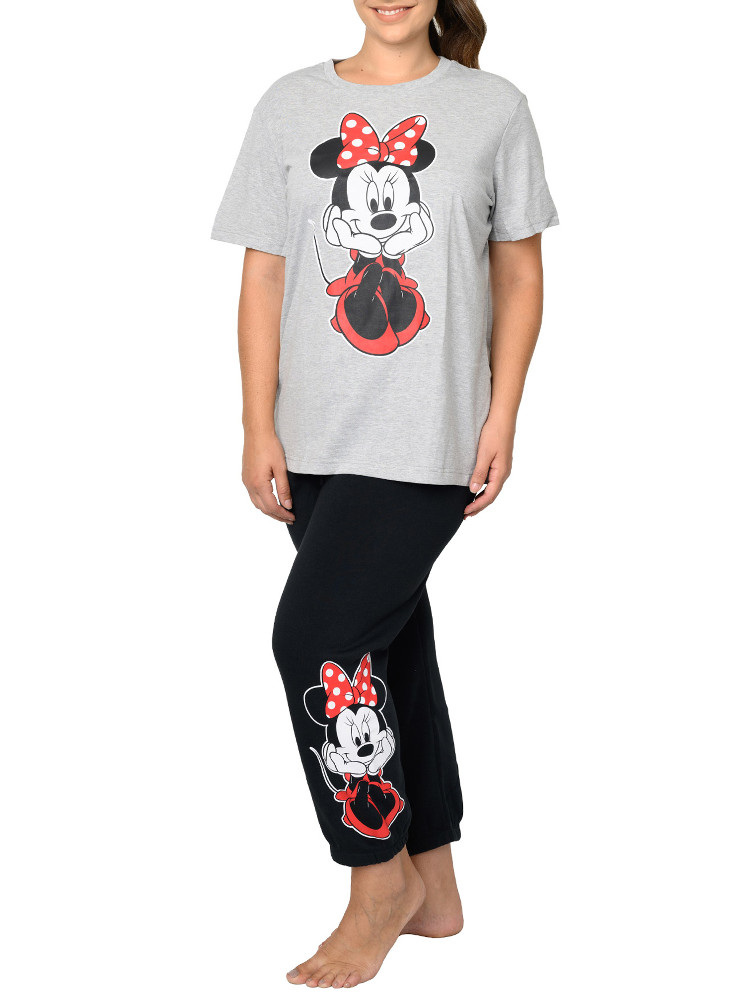 - Set Includes: (1) Women's Plus Size Disney Minnie Mouse Sitting Short Sleeve T-Shirt Gray & (1) Minnie Mouse Fleece Jogger Pants Womens Plus Size Disney Elastic Cuff Black