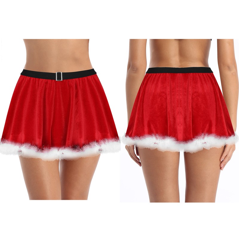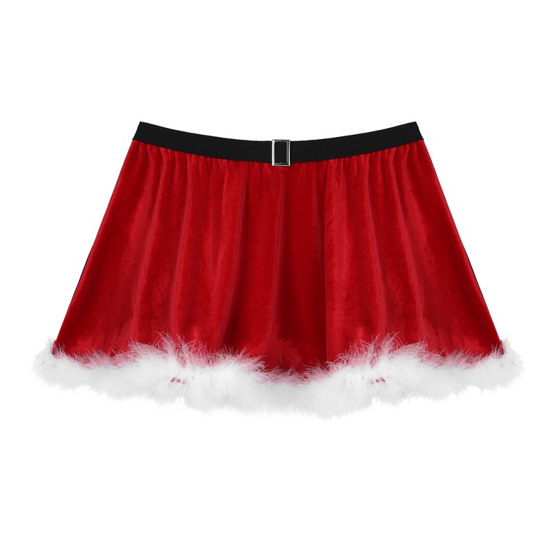 Red velvet skirt for women with white feather trimming to create a Christmas atmosphere.