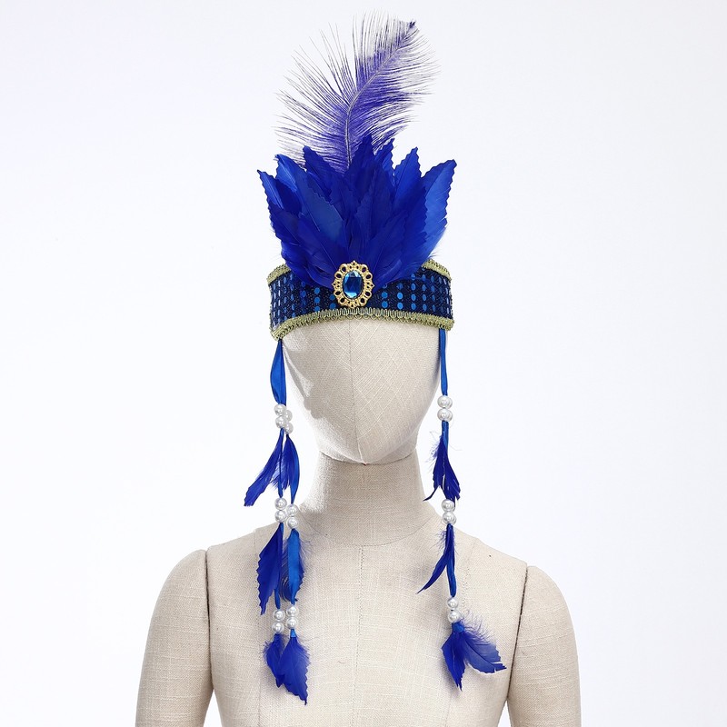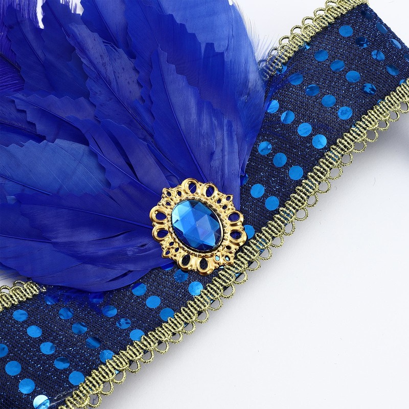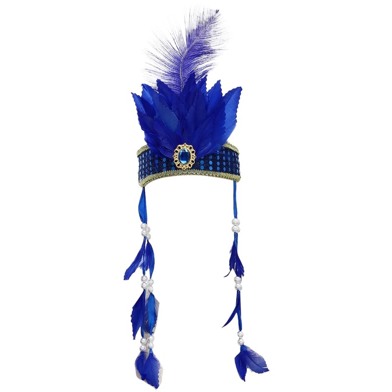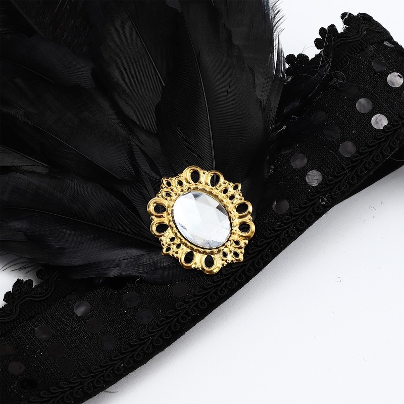 The headdress has sparkly sequins and metallic trim, adding a touch of glamour and shine, making it a trendy and eye-catching accessory.