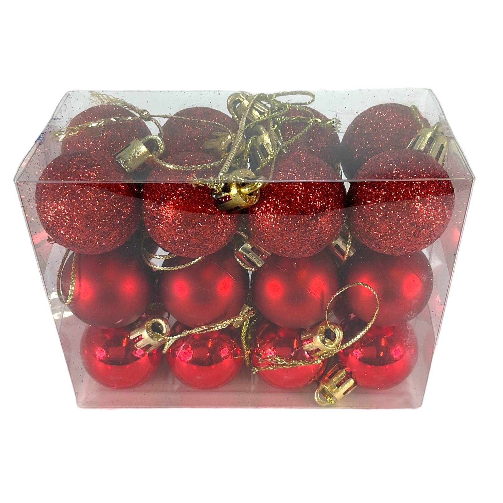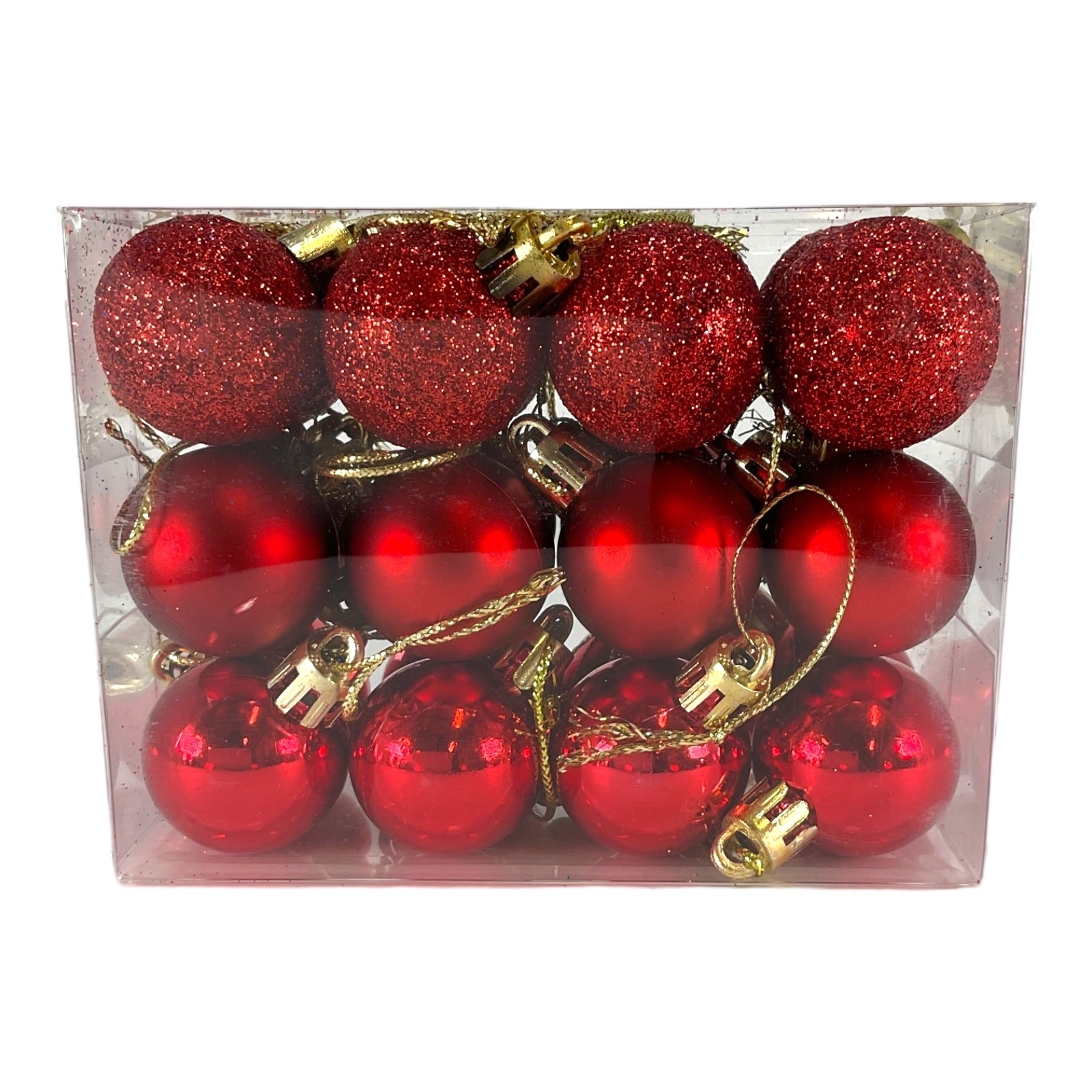 Red Ball Christmas Ornaments. Pack of 24 ornaments. Includes 8 Shiny, 8 Glitter, 8 Matte. Mate from shatterproof plastic. Balls are 1.2 inches (3cm, 30mm). Includes gold string you can use to hang the ornaments