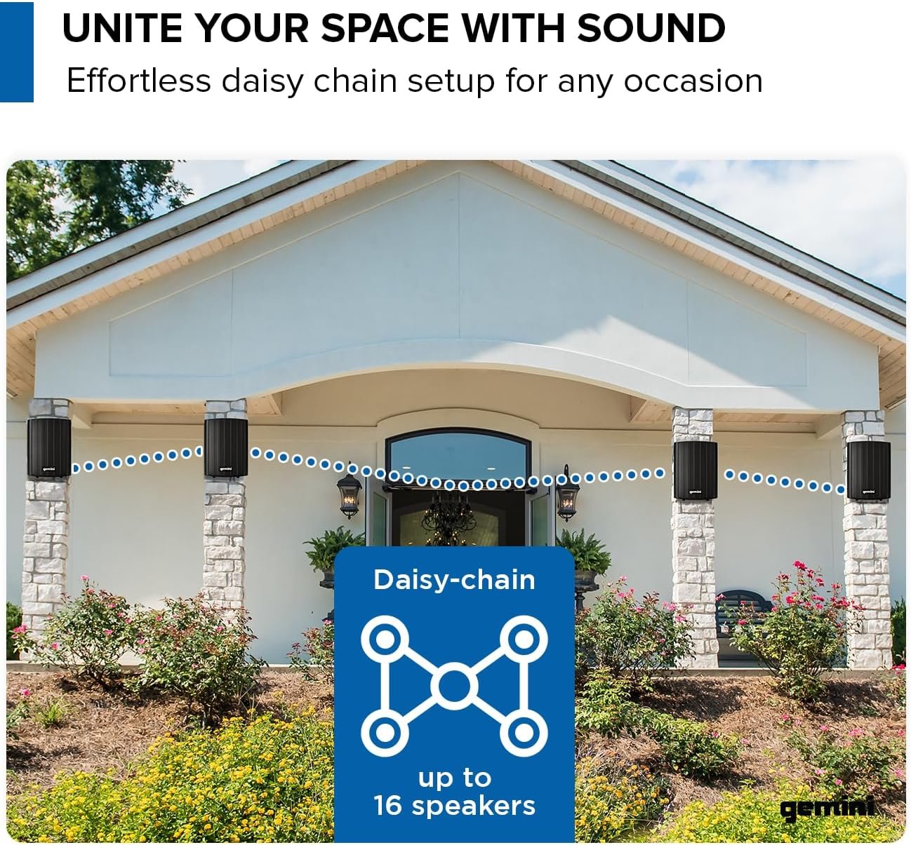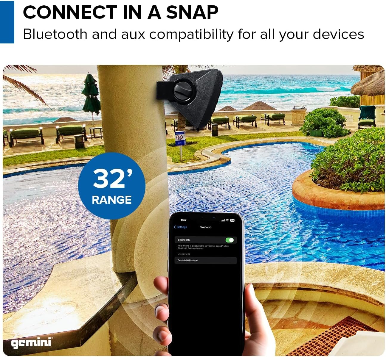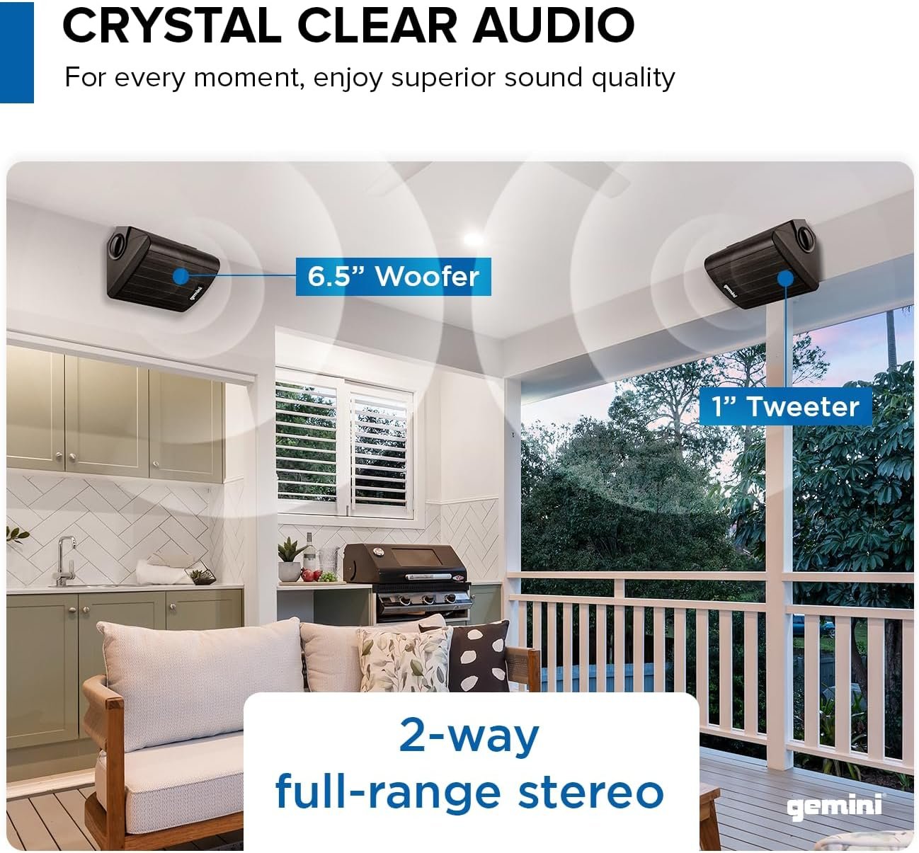 This PAIR of Gemini mountable Bluetooth speakers features powerful 6.5" woofers and 1" tweeters for exceptional audio performance. Perfect for large patios, backyards, decks, or boats. Active/passive design with wireless connectivity and waterproof protection. Sleek black finish looks professional anywhere.