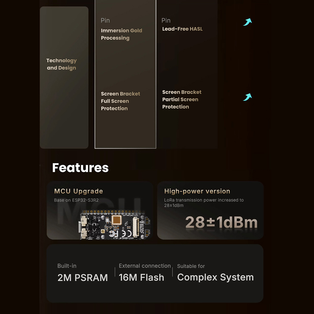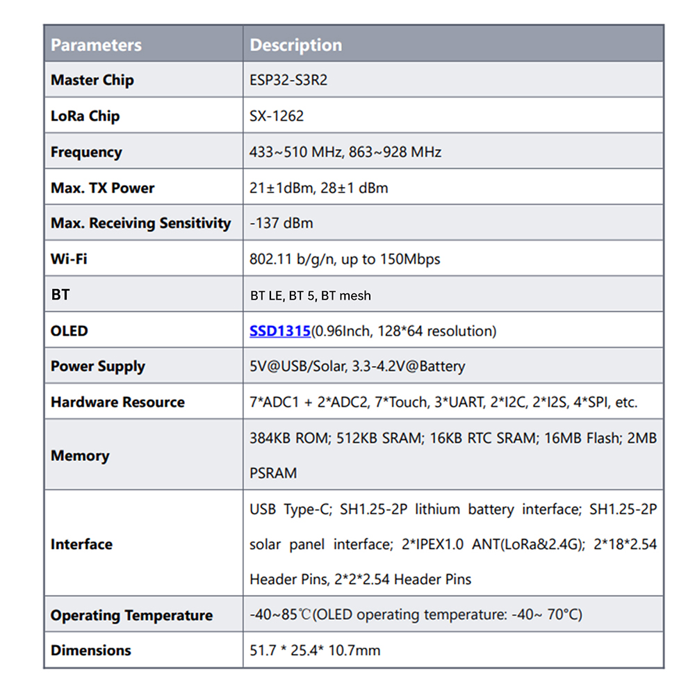- Based on ESP32-S3R2 and SX-1262, supporting Wi-Fi b/g/n, BLE, and LoRa communication.