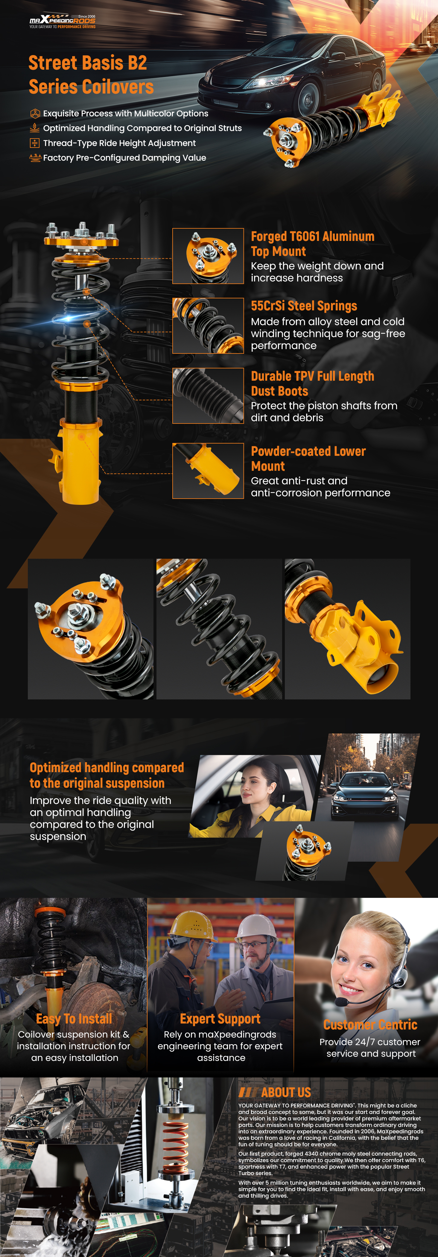 MXR-B2 coil-overs are designed as entry-level for street use. It features height adjustable and adjustable camber plates (applicable for some vehicles), which offer you a lowered stance, and improved performance for your daily use vehicle.
