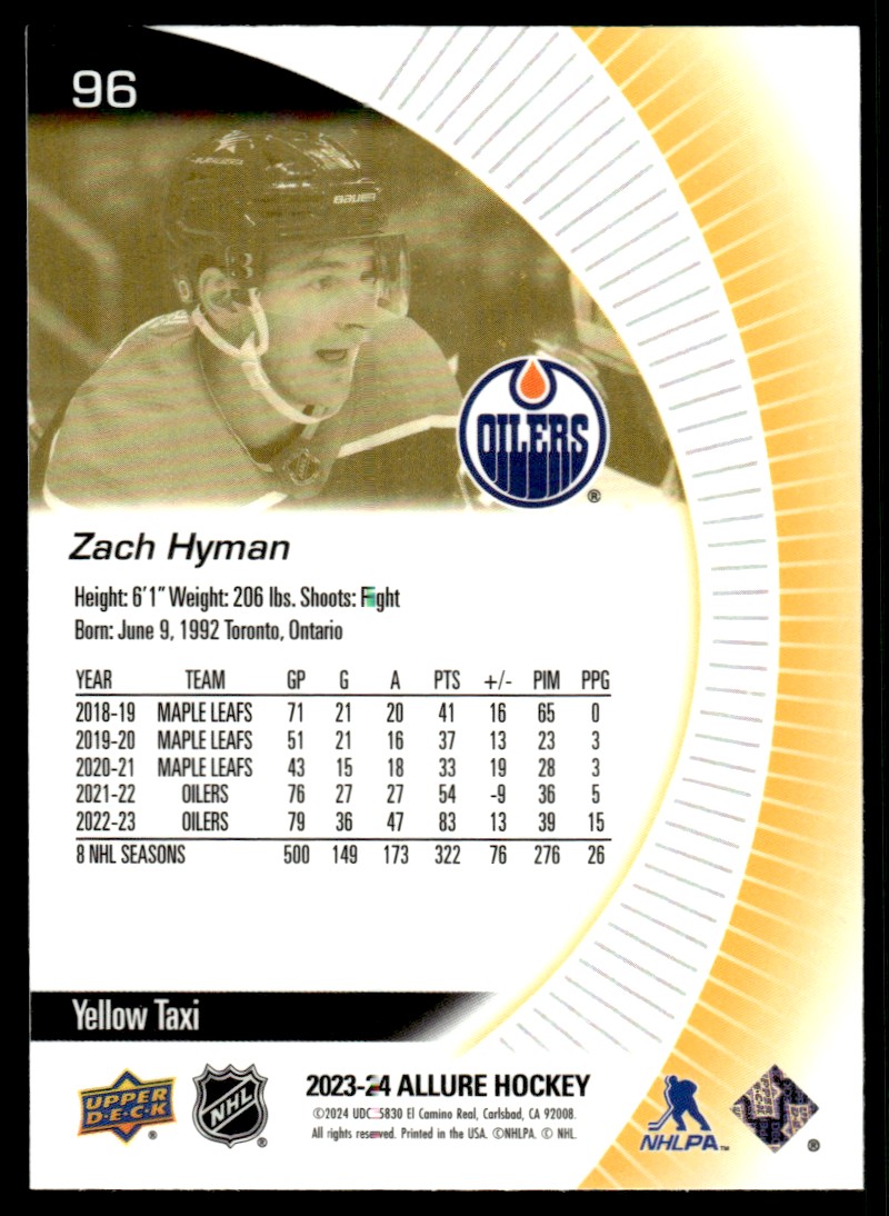 | 2023-24 Upper Deck Allure Yellow Taxi Zach Hyman Edmonton Oilers #96 |