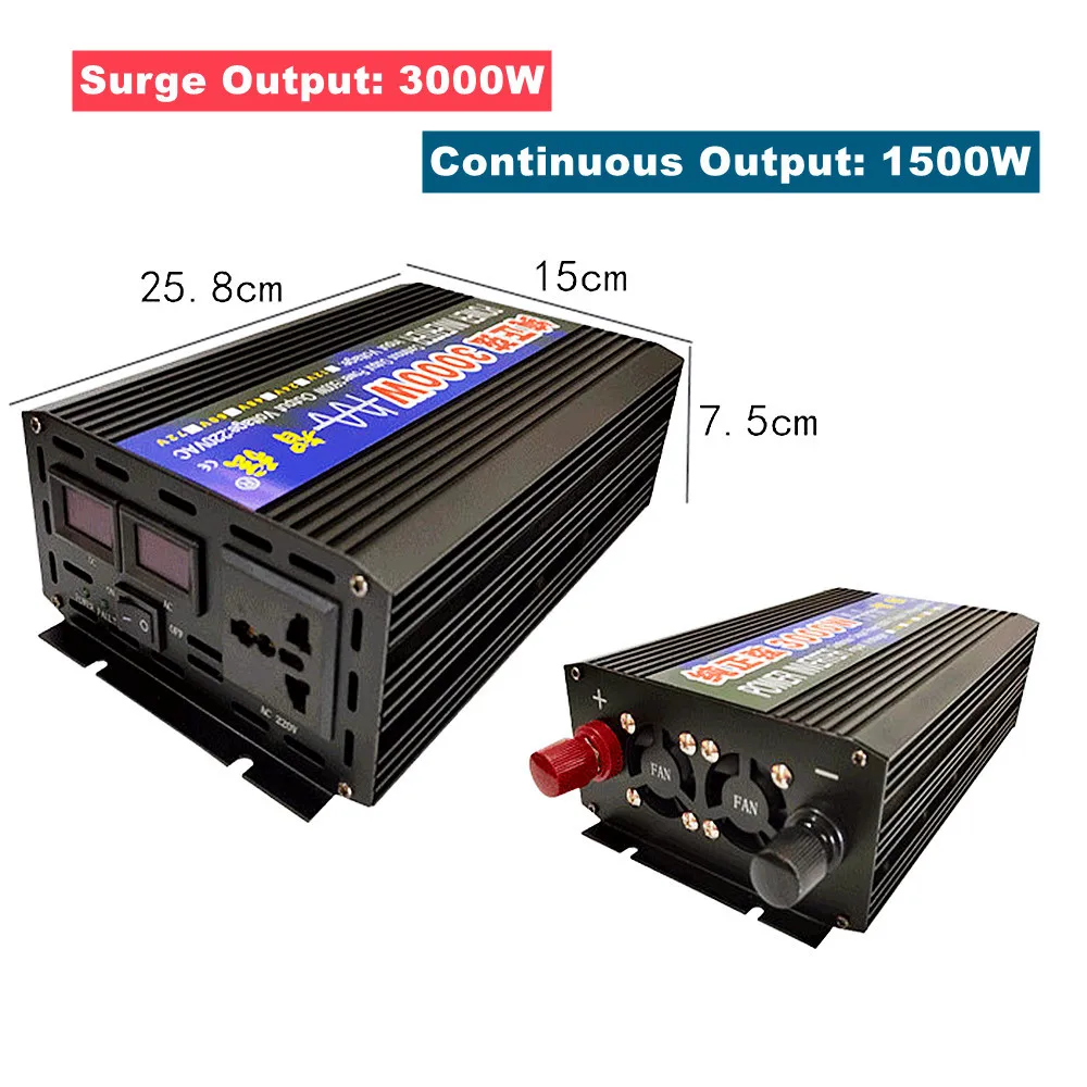 3000W Model Parameters: Surge Output Power: 3000W Continuous Output Power: 1500W Input Voltage: 12V/24V/48V/60V Output Voltage: 220V Frequency: 50Hz/60Hz Display: Double