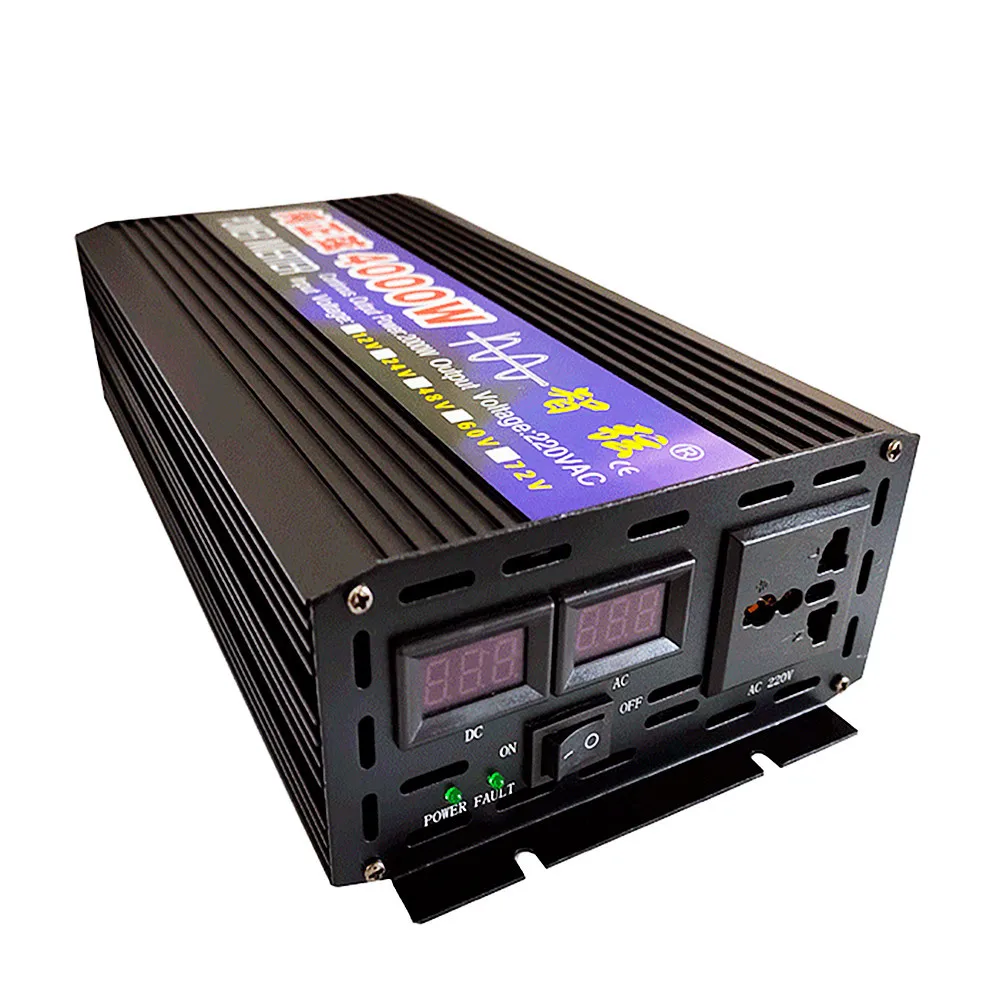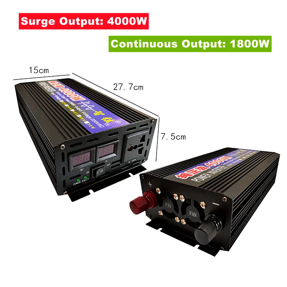4000W Model Parameters: Surge Output Power: 4000W Continuous Output Power: 1800W Input Voltage: 12V/24V/48V/60V Output Voltage: 220V Frequency: 50Hz/60Hz Display: Double