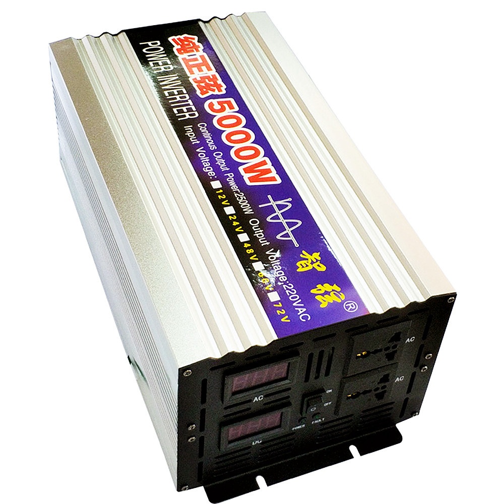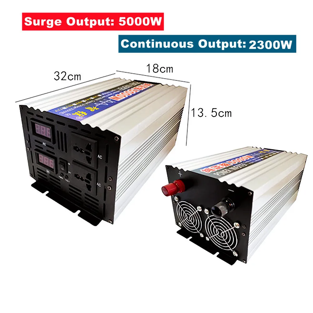 5000W Parameters: Surge Output Power: 5000W Continuous Output Power: 2300W Input Voltage: 12V/24V/48V/60V Output Voltage: 220V Frequency: 50Hz/60Hz Display: Double