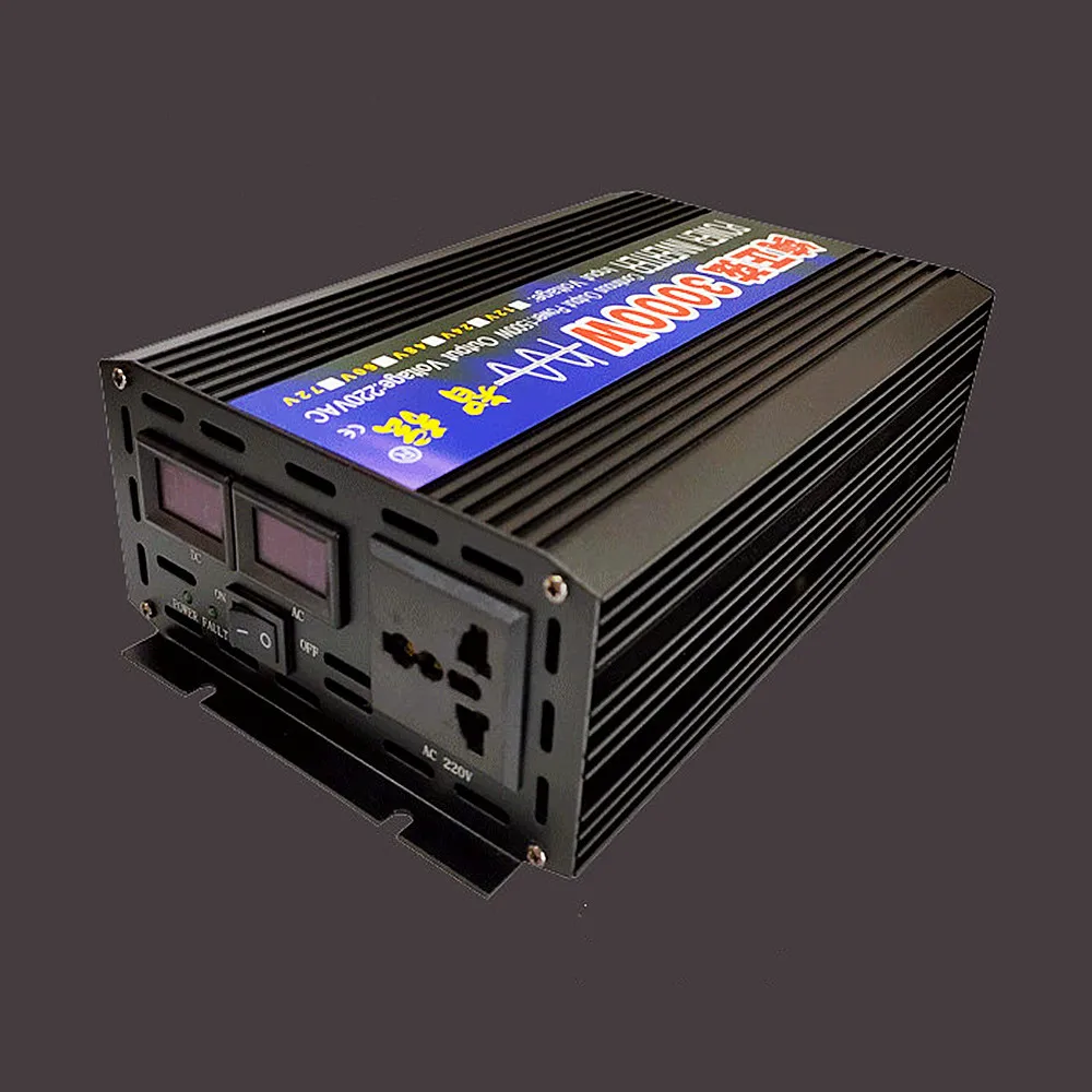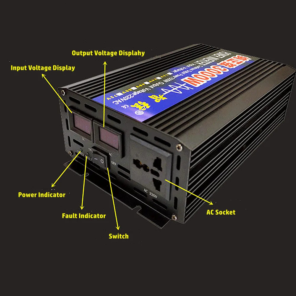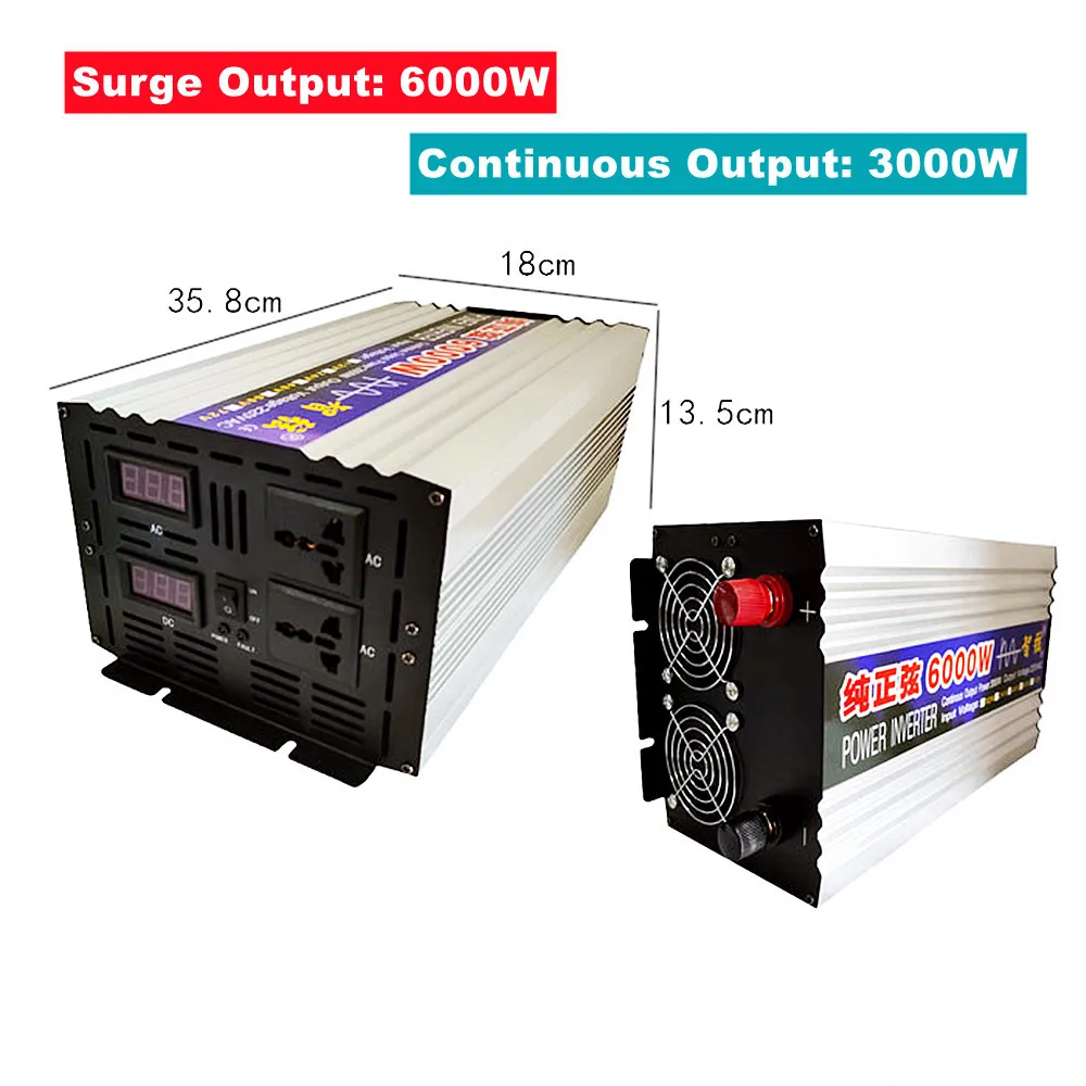 6000W Parameters: Surge Output Power: 6000W Continuous Output Power: 3000W Input Voltage: 12V/24V/48V/60V Output Voltage: 220V Frequency: 50Hz/60Hz Display: Double