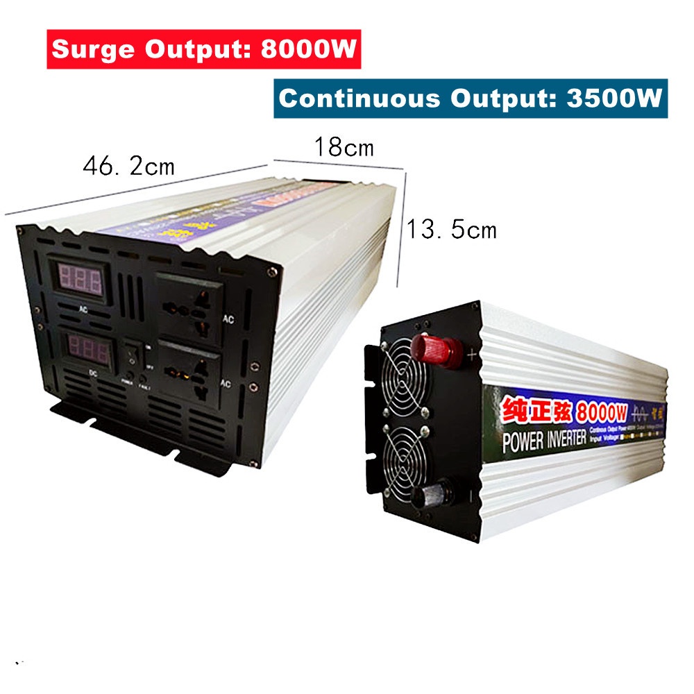 8000W Parameters: Surge Output Power: 8000W Continuous Output Power: 3500W Input Voltage: 12V/24V/48V/60V Output Voltage: 220V Frequency: 50Hz/60Hz Display: Double
