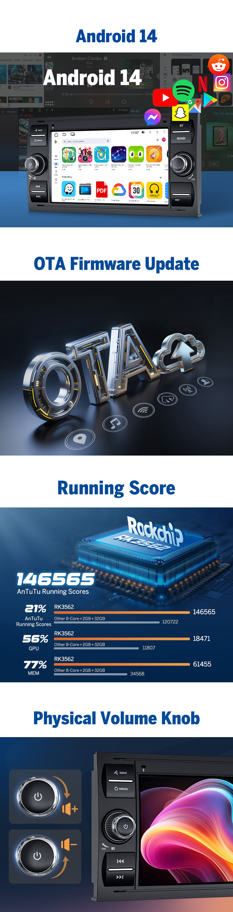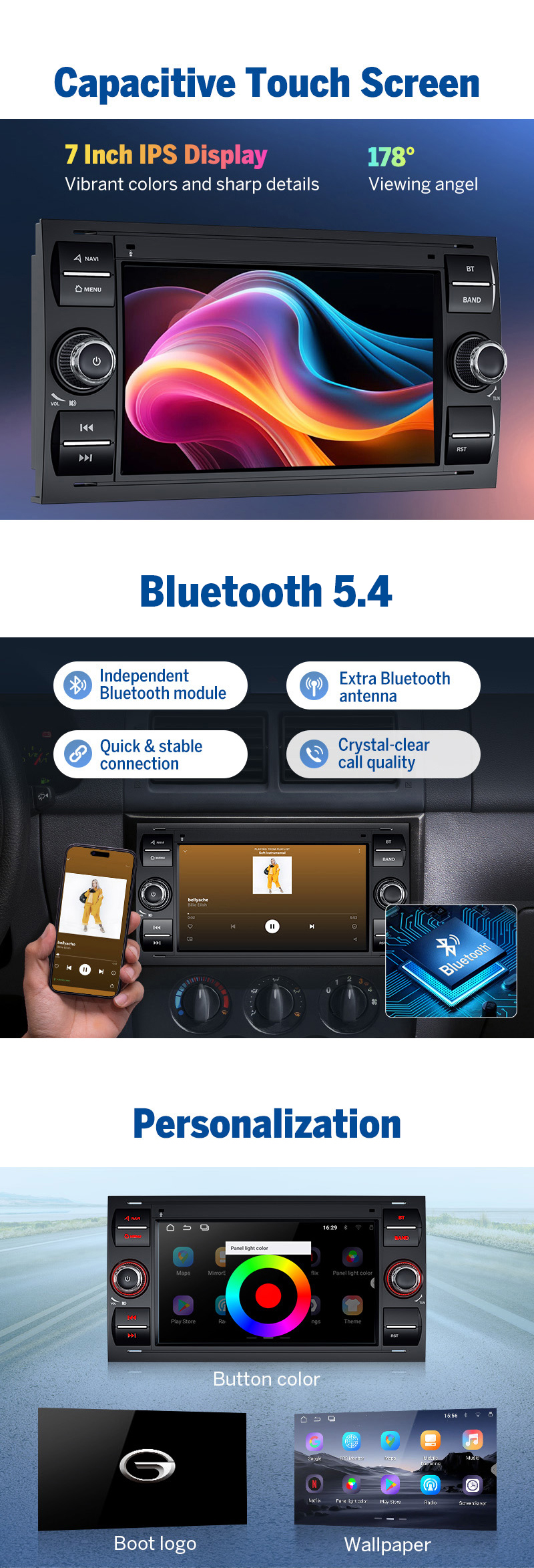 Für Ford-Besitzer, die ein modernes Android 14 Autoradio mit erweiterten Smart-Funktionen suchen, bietet dieses System optimale Lösung. Besonders gefragt sind Features wie kabelloses CarPlay, Android Auto, GPS Navigation / Navi, Bluetooth 5.4, 7-Zoll Touchscreen, Split-Screen-Multitasking, DSP-Sound, RAM/ROM-Leistung und CANBUS-Kompatibilität. Dank WiFi 6, OTA-Updates, DAB/DAB+-Option und erweiterbaren Funktionen wie Dashcam oder OBD2 ist das Gerät ideal für Multimedia, Navigation und Telefonie unterwegs. Käufer suchen häufig nach 2-DIN / Doppel-DIN Nachrüstsystemen, CarPlay Retrofit, Android Auto Upgrade, Ford kompatibel, Infotainment Upgrade oder Factory-Integration ohne Fehlermeldungen. Diese Kombination aus Performance, Stabilität und Kompatibilität macht das Autoradio zur Top-Wahl für Ford Focus, Fiesta, Mondeo, Kuga, Transit, S-Max, C-Max und weitere Modelle.