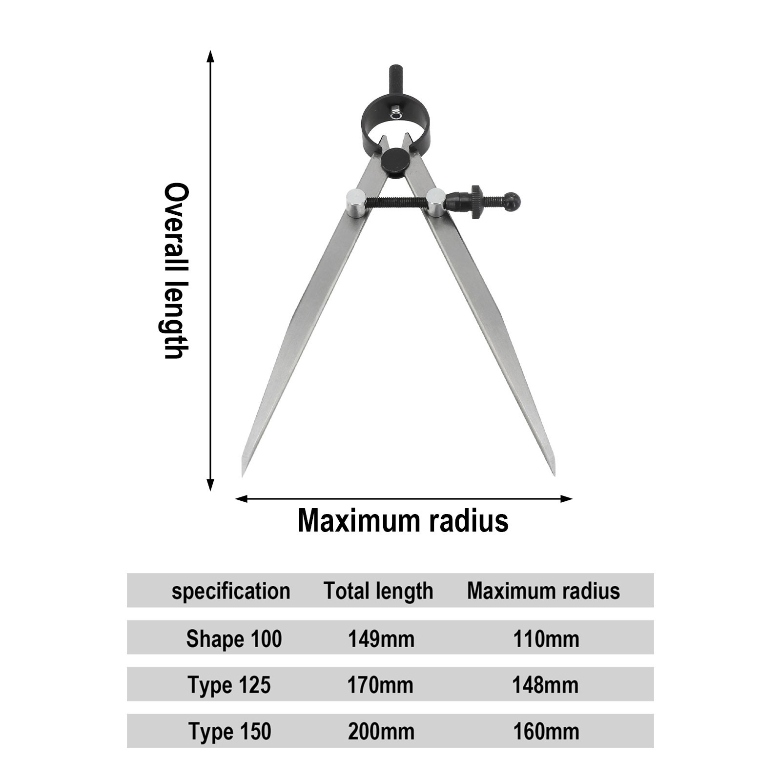 La longueur des jambes est de 6 pouces, la portée maximale est de 6 pouces et il peut dessiner un cercle jusqu'à 12 pouces.
