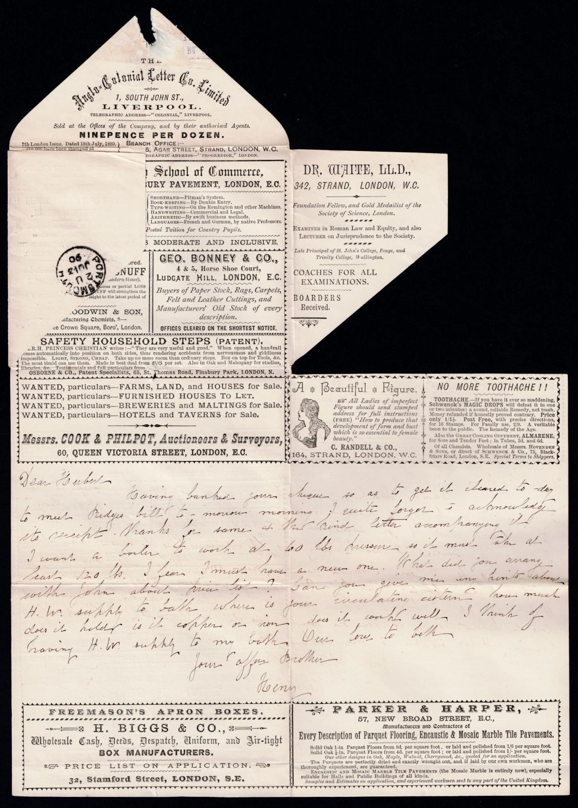 A penny pink used Southampton to Portsmouth 13 June 1890, multiple advertisements inside of the Anglo-Colonial Letter Co Ltd, including pictorial and one promising no more toothache! Much rarer advert than usually seen, slightly bigger than my A3 scanner will take so image slightly cropped in places, not the envelope! Fabulous and rare item.