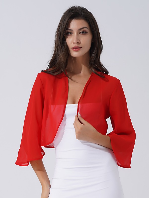 Open front design, 3/4 flare sleeve, cropped length, solid color.