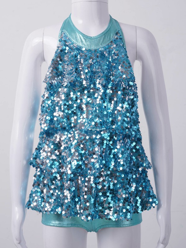 Halter neck with clasp closure. Open upper back. Shorty unitard decorated with tiered sequined mesh layers.