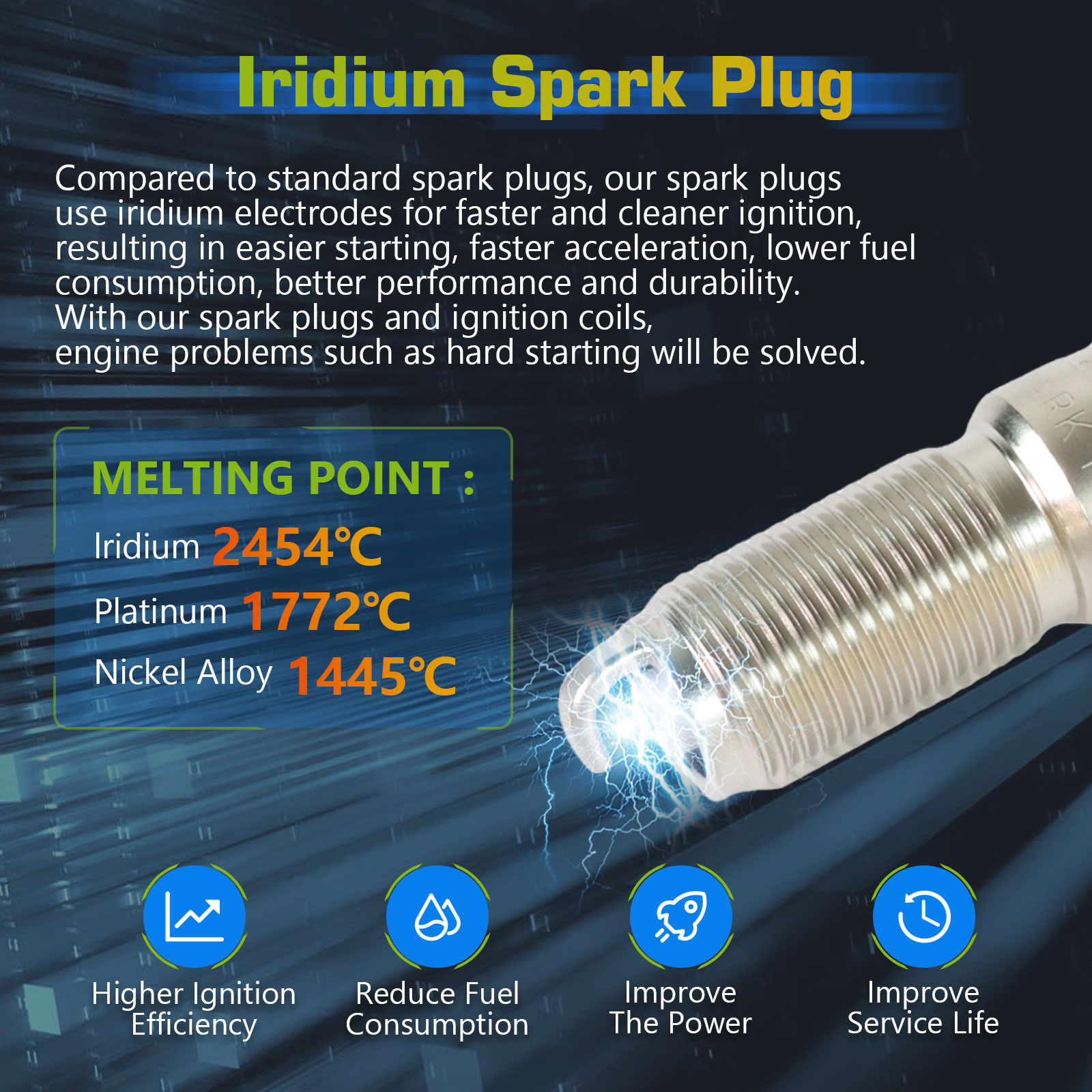 Spark Plugs are using High-Performance Iridium metal, Much better than Nickel and Platinum