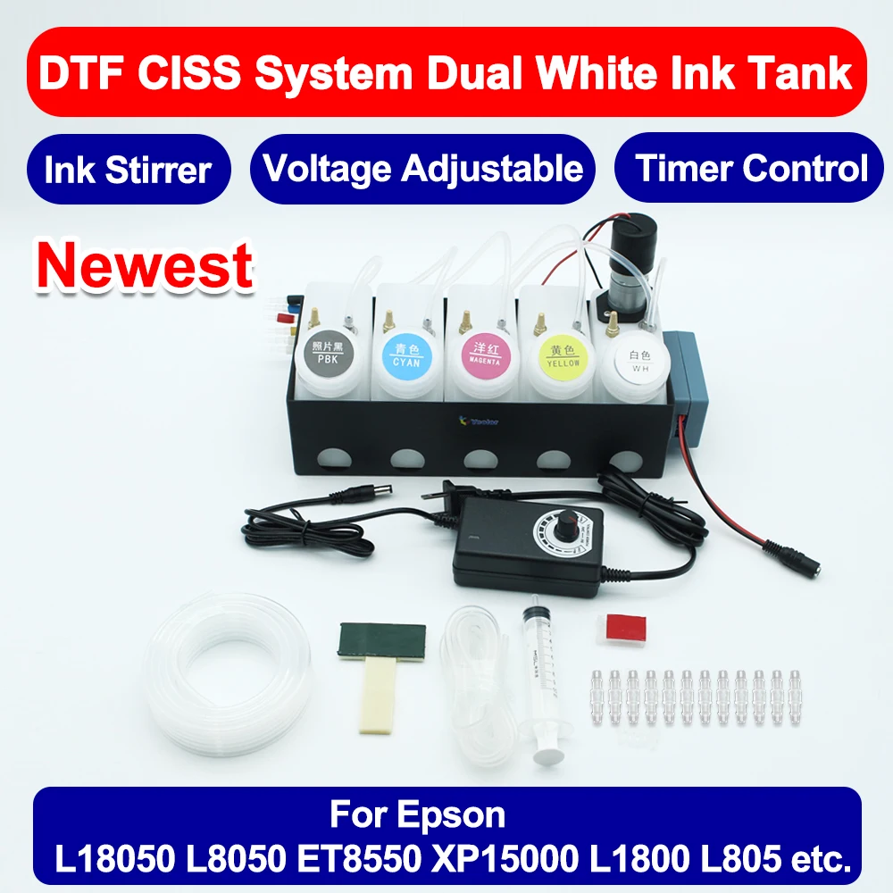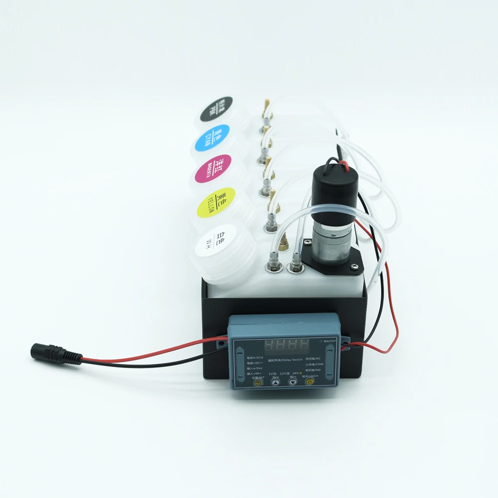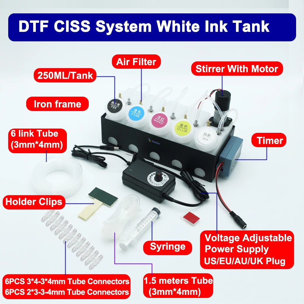 2). Timer Control White Ink tanks' stirrers 3). 1 outhole for C / M / Y / K Tanks, 2 outholes for White Tanks. 4). 6 Lines Ink Tube(3mm*4mm) 5). 1.5 Meters Ink Tube (3mm*4mm) 6). 6PCS 3*4mm-3*4mmTube Connectors / 6PCS 3*4mm-3*2mmTube Connectors 7). Tube Holder Clips; 8). 1PC Syringe; |