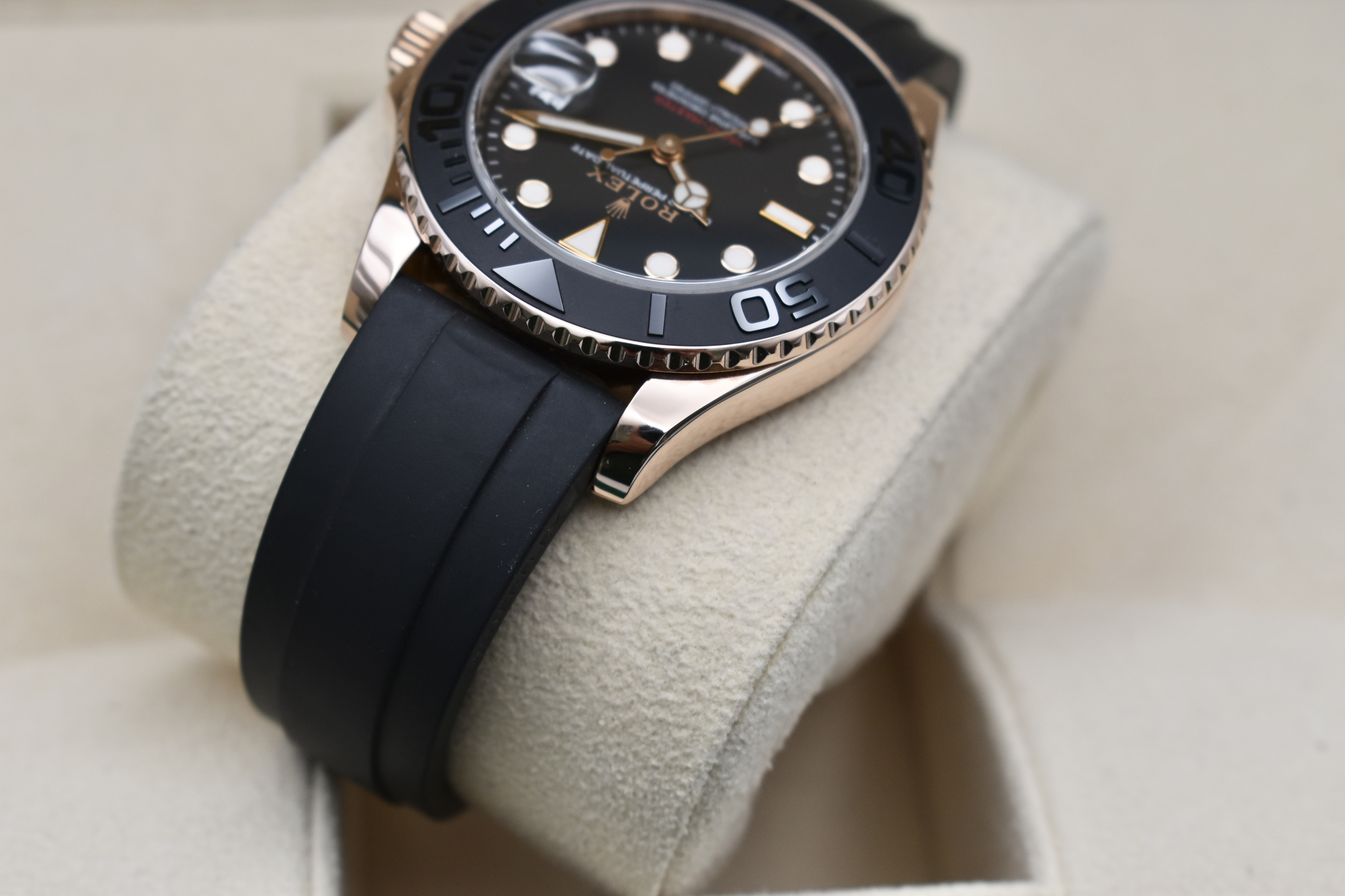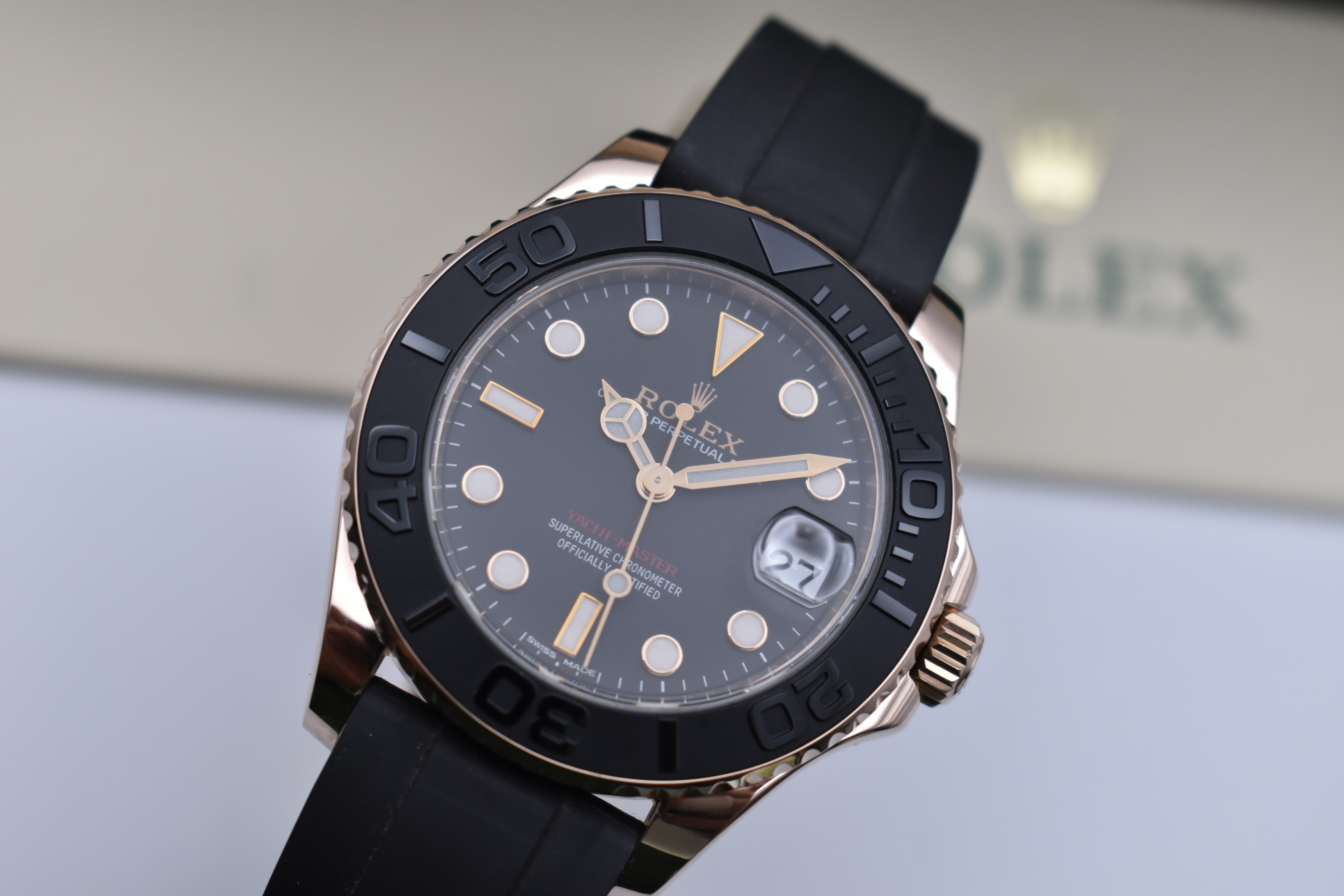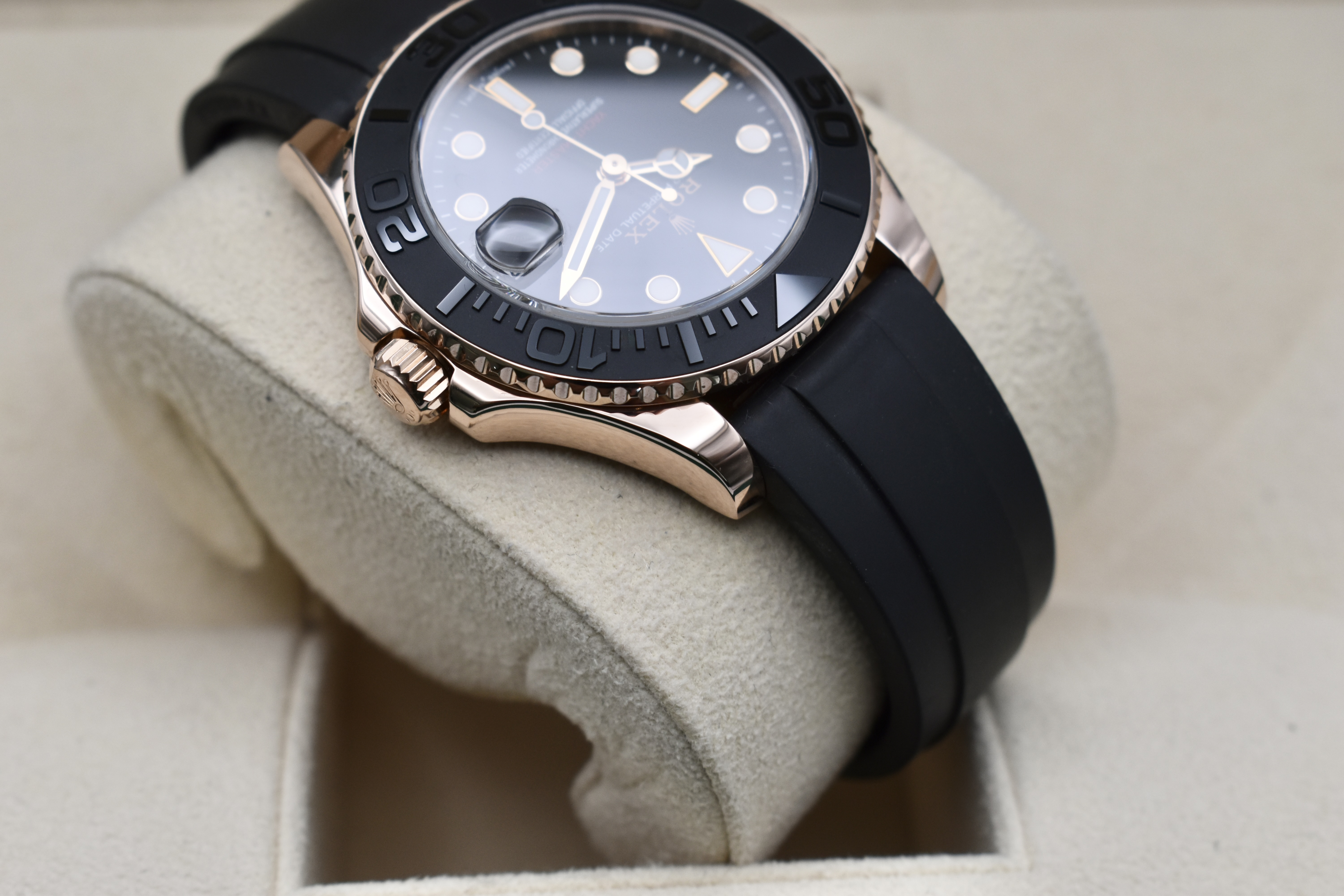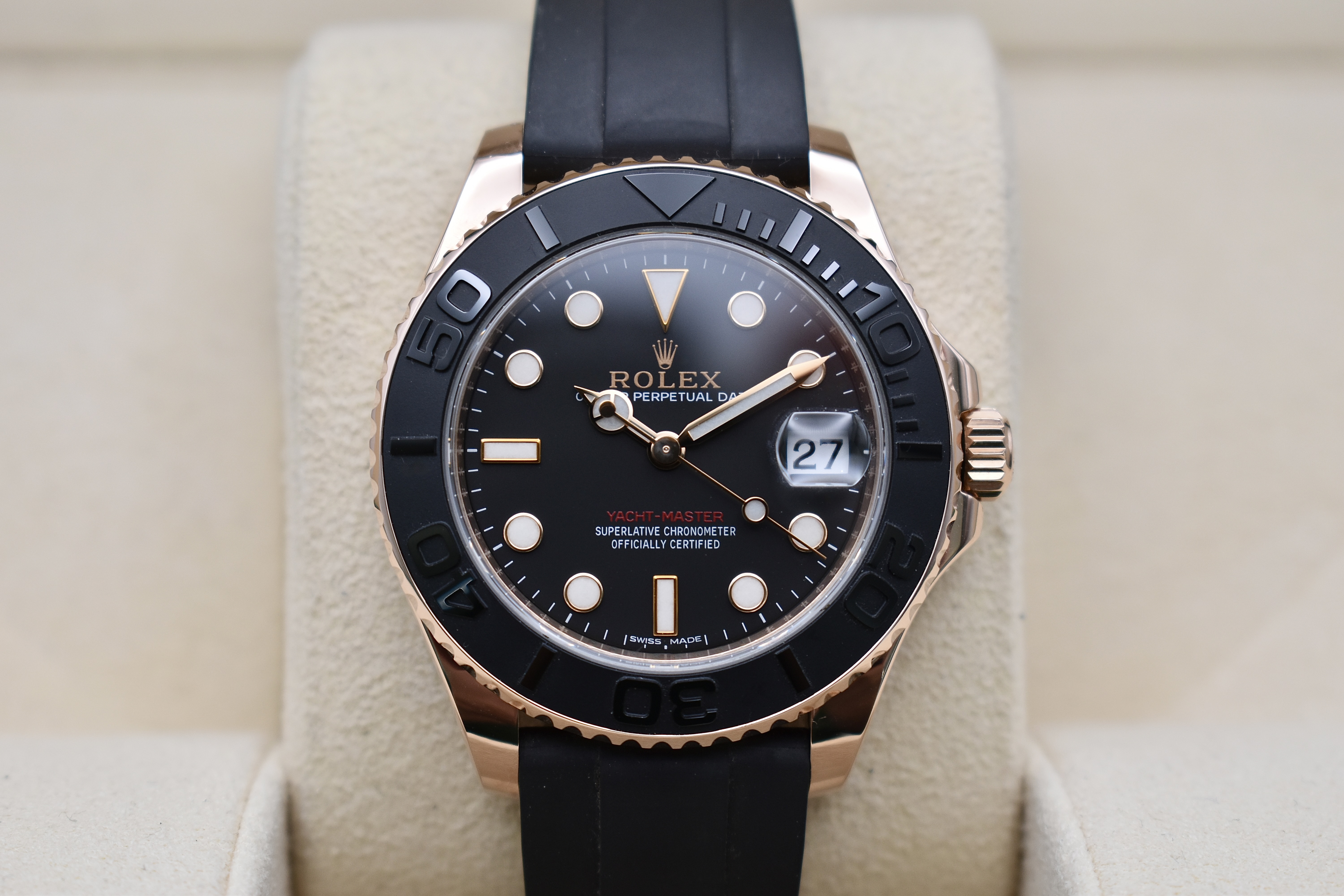 Experience the perfect blend of sporty sophistication and timeless elegance with the Rolex Yacht-Master 37 mm Oysterflex in 18ct Everose Gold (ref. 268655). This exquisite model captures Rolex’s mastery of both luxury and performance — designed for those who appreciate precision, power, and prestige.Crafted from Rolex’s exclusive Everose Gold alloy, the Yacht-Master 37 features a bidirectional rotatable bezel with a matte black Cerachrom insert, raised polished numerals, and a sleek black dial that glows with Chromalight luminosity. The innovative Oysterflex bracelet combines the comfort of high-performance elastomer with the strength of a metal blade core, delivering both durability and refinement.At its heart beats the Calibre 2236 automatic movement, a certified Superlative Chronometer ensuring unrivalled precision and reliability. With 100 metres of water resistance, the Yacht-Master 37 mm is equally at home on deck or at an evening engagement.