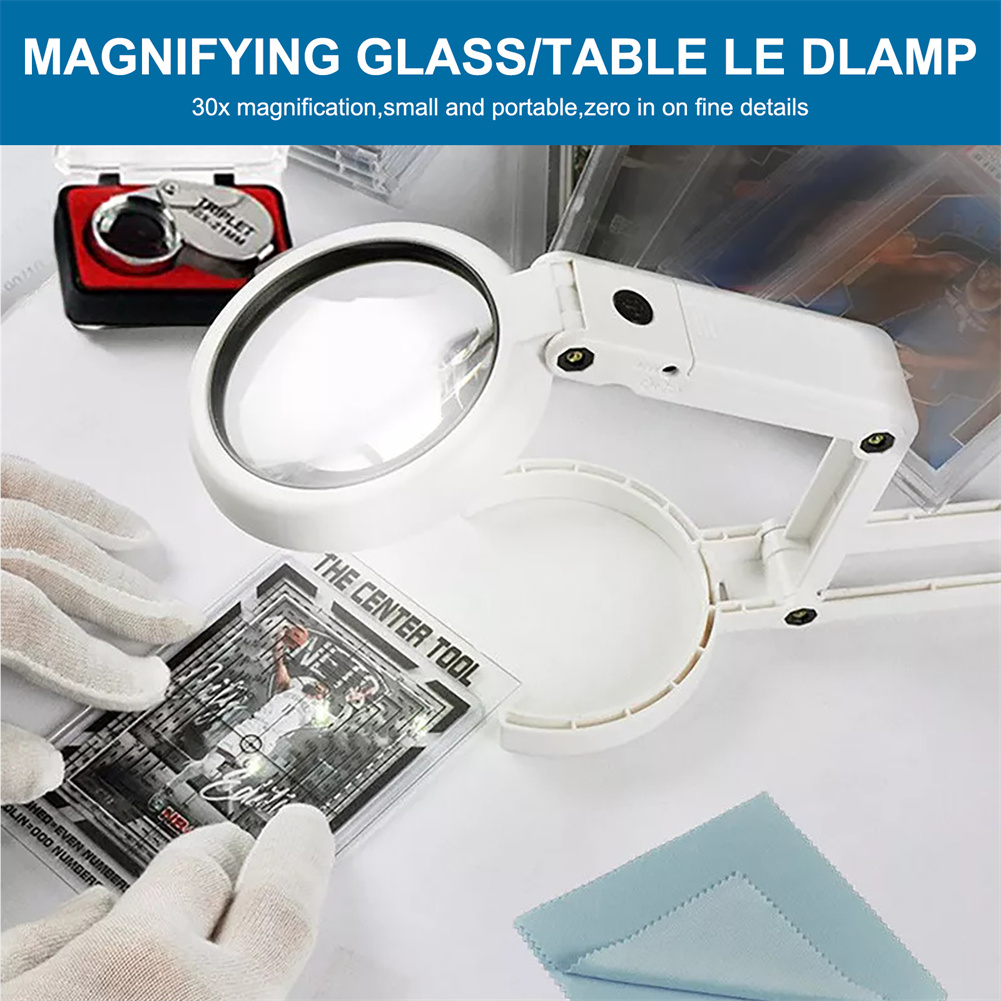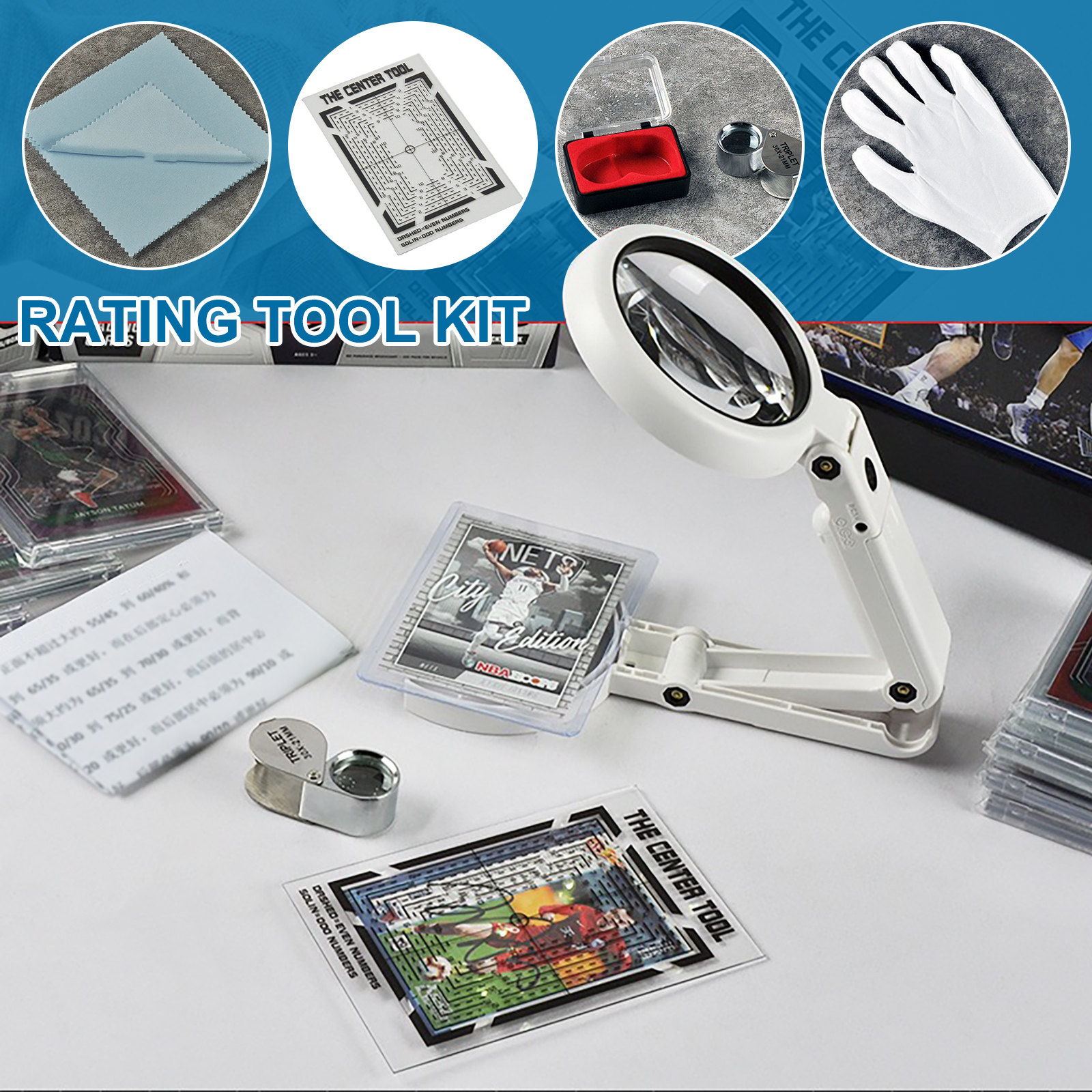 【COMPLETE CARD GRADING KIT INCLUDES】One centering guide (card)+one 30x magnifying loupe+one LED Magnifying Table Lamp+10pcs microfiber cloth+a pair of white gloves.