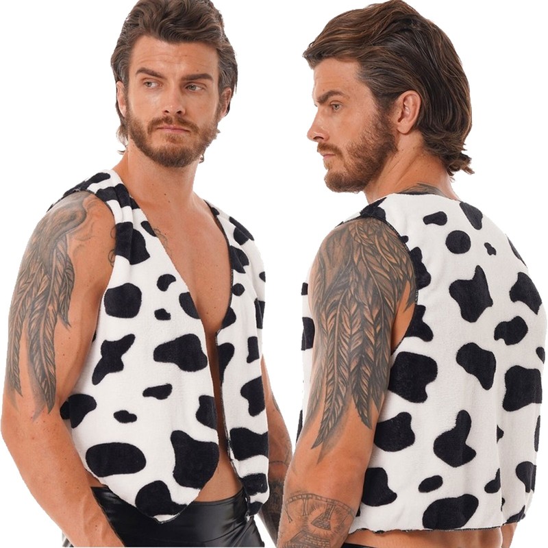 Men Open Front V Neck Sleeveless Vest Cow Printed Flannel Waistcoat Tops.