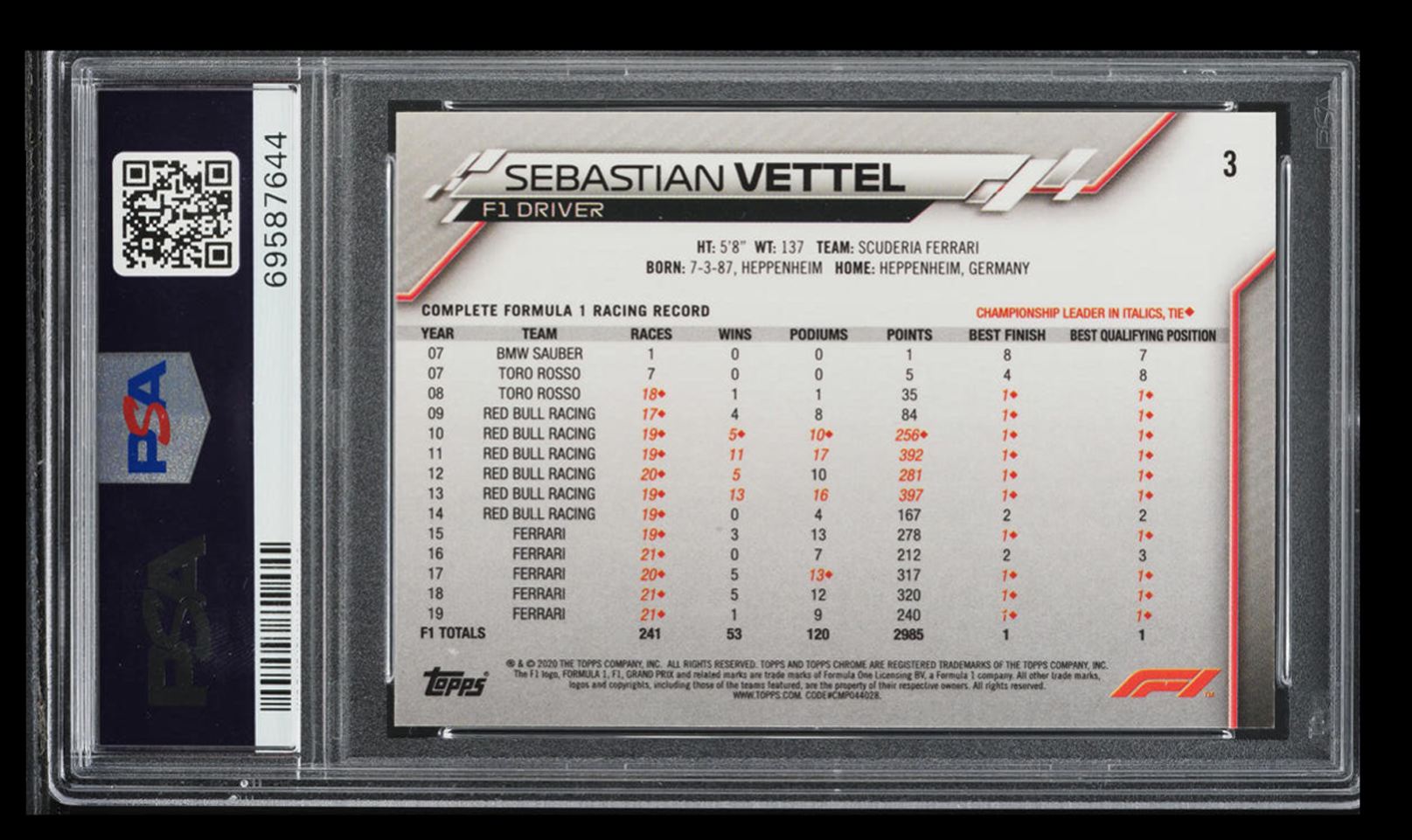| 2020 Formula 1 Topps Chrome Sebastian Vettel PSA 9 #3 |