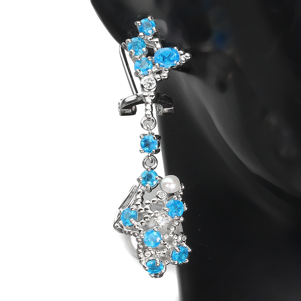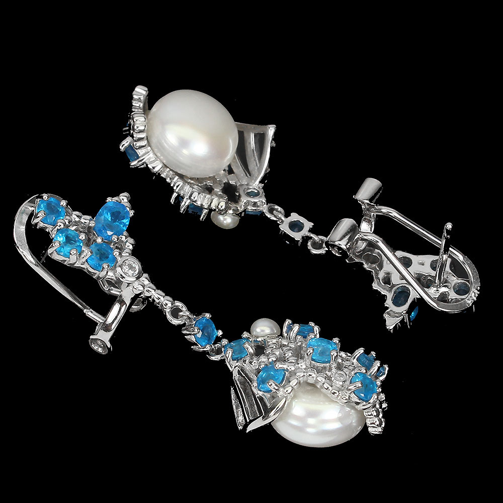 Unheated Oval Blue Apatite 4x3mm Pearl Simulated Cz 925 Sterling Silver Earrings