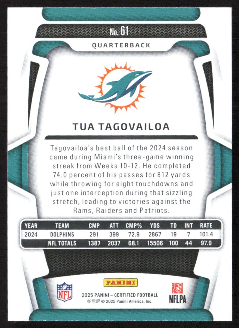 | 2025 Panini Certified Base Tua Tagovailoa Miami Dolphins #61 | ||||||||||||||||||