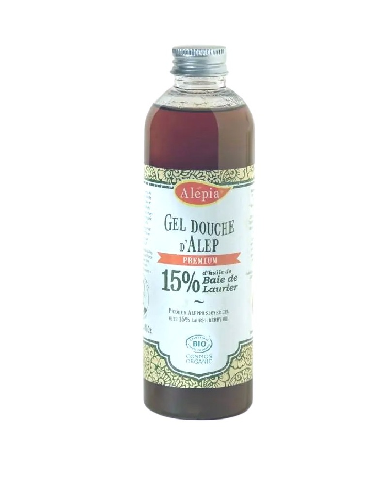 Le gel douche Alepia Premium 15% d'huile de baie de Laurier allie toute la douceur et les vertus du savon d’Alep pour un lavage naturel et respectueux de la peau.