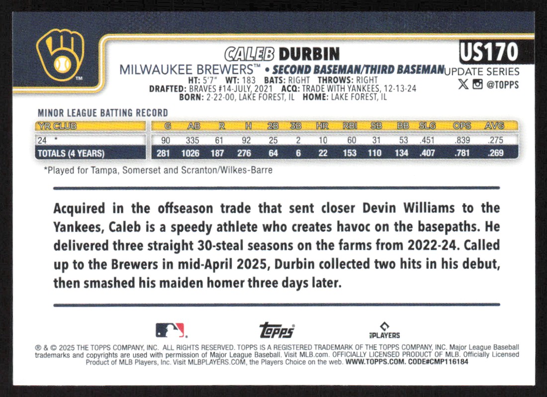 | 2025 Topps Update Series Base Caleb Durbin RC Milwaukee Brewers #US170 | ||||||||||||||||||||