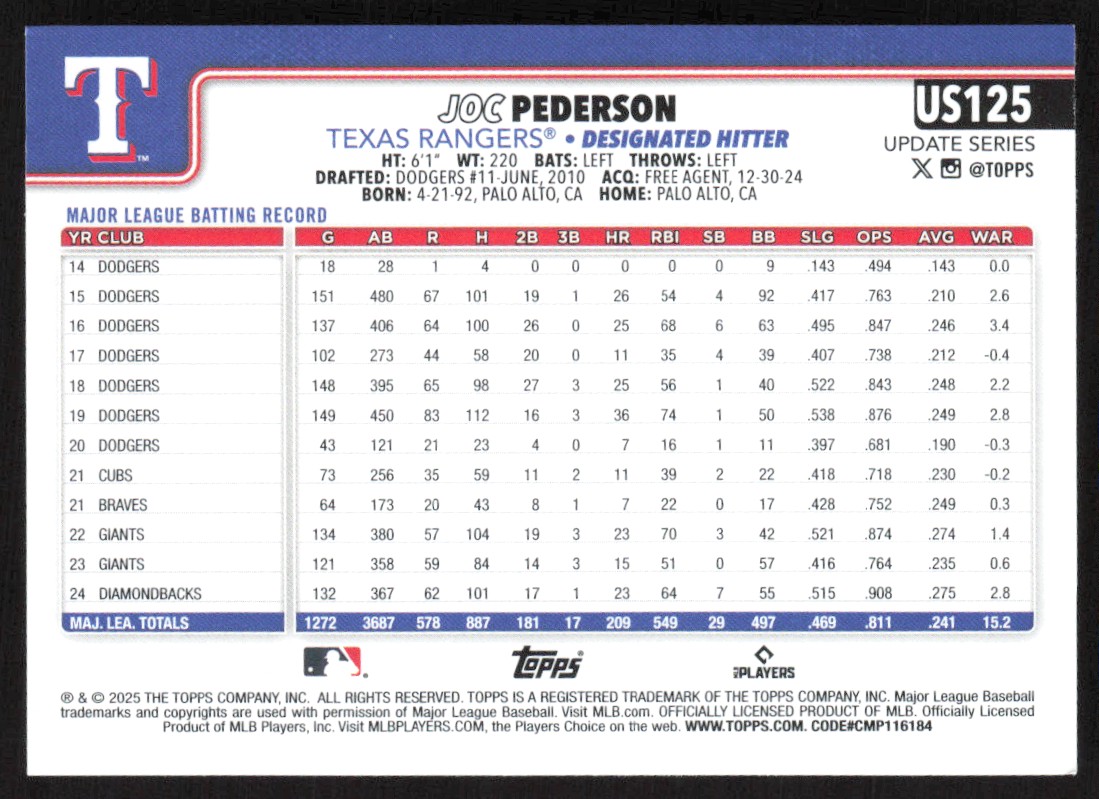 | 2025 Topps Update Series Base Joc Pederson Texas Rangers #US125 | ||||||||||||||||||