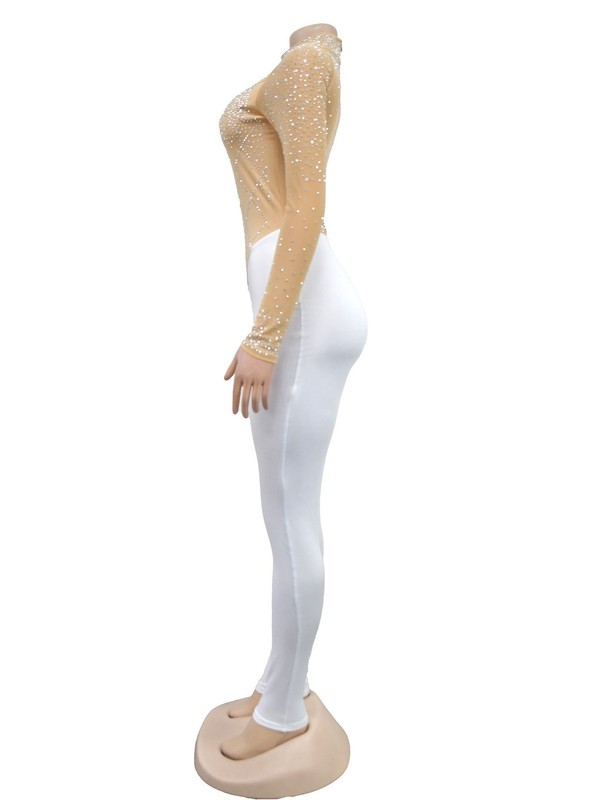 The sheer mesh patchwork details bring a trendy and edgy element to the classic jumpsuit design, adding a modern and fashionable twist.