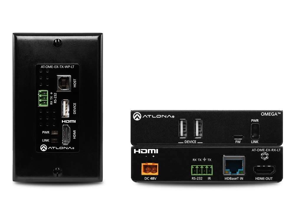The Atlona AT-OME-EX-WP-KIT-LT is an HDBaseT extender for video up to 4K/60 4:2:0, plus embedded audio, control, and USB over distances up to 130 feet (40 meters) for 4K/UHD, and up to 230 feet (70 meters) for 1080p/60 video. The transmitter features a US one-gang, wallplate form factor, and includes interchangeable black and white wallplates and faceplates. Part of the Omega™ Series of integration products for modern AV communications and collaboration, the OME-EX-WP-KIT-LT is HDCP 2.2 compliant and extends RS-232 control signals. The integrated USB extension addresses the challenge of connecting between USB devices at remote locations, and is ideal for software video conferencing and touch or interactive displays. The transmitter includes a USB 2.0 host interface for a PC, plus a peripheral device such as a speakerphone, microphone, or keyboard and mouse. The receiver provides two USB interfaces for devices such as a camera, soundbar, or display. The OME-EX-WP-KIT-LT incorporates many popular integration convenience features, while delivering excellent performance and value for 4K presentation and video conferencing applications. The receiver remotely powers the transmitter over HDBaseT. USB Extension for Video Conferencing with Zoom, Skype for Business, Microsoft Teams, and More The OME-EX-WP-KIT-LT features integrated USB extension over HDBaseT up to 230 feet (70 meters). This capability, plus interfacing for host PCs and USB peripherals makes the OME-EX-WP-KIT ideal for video conferencing and UC (unified communications) platforms such as Zoom, Skype® for Business, Microsoft® Teams®, Cisco® Webex®, BlueJeans, and GoToMeeting®. Available from Atlona is the AT-HDVS-CAM PTZ camera with USB interface. Applications - Video conferencing - The OME-EX-WP-KIT-LT is ideal for soft codec and web-based conferencing applications, with the ability to integrate with a PC and speakerphone or microphone near presenters, and a camera or soundbar at the wall-mounted display.