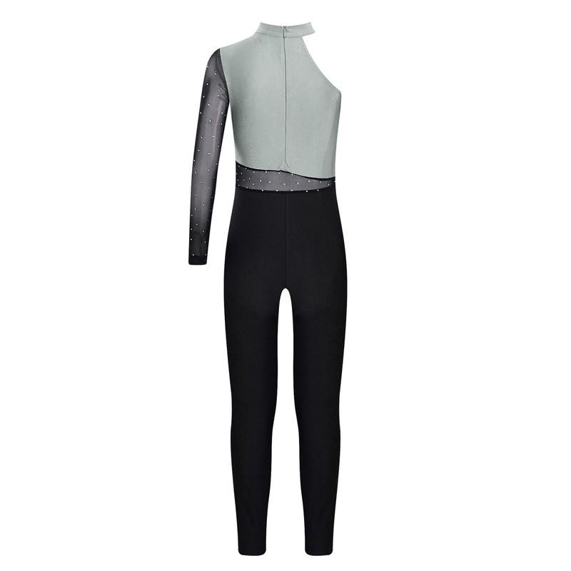 Girls’s long sleeve jumpsuit with one shoulder design, and back invisible zipper for easy wearing and taking off.