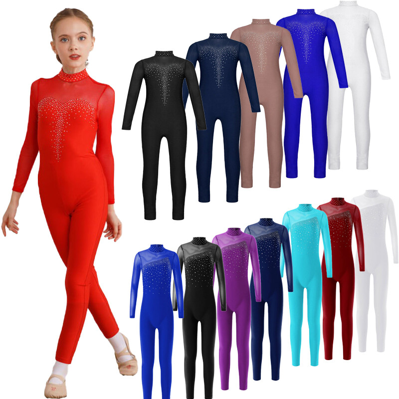 Full length gymnastics jumpsuit ensures total movement and flexibility when leaping, dancing or tumbling.