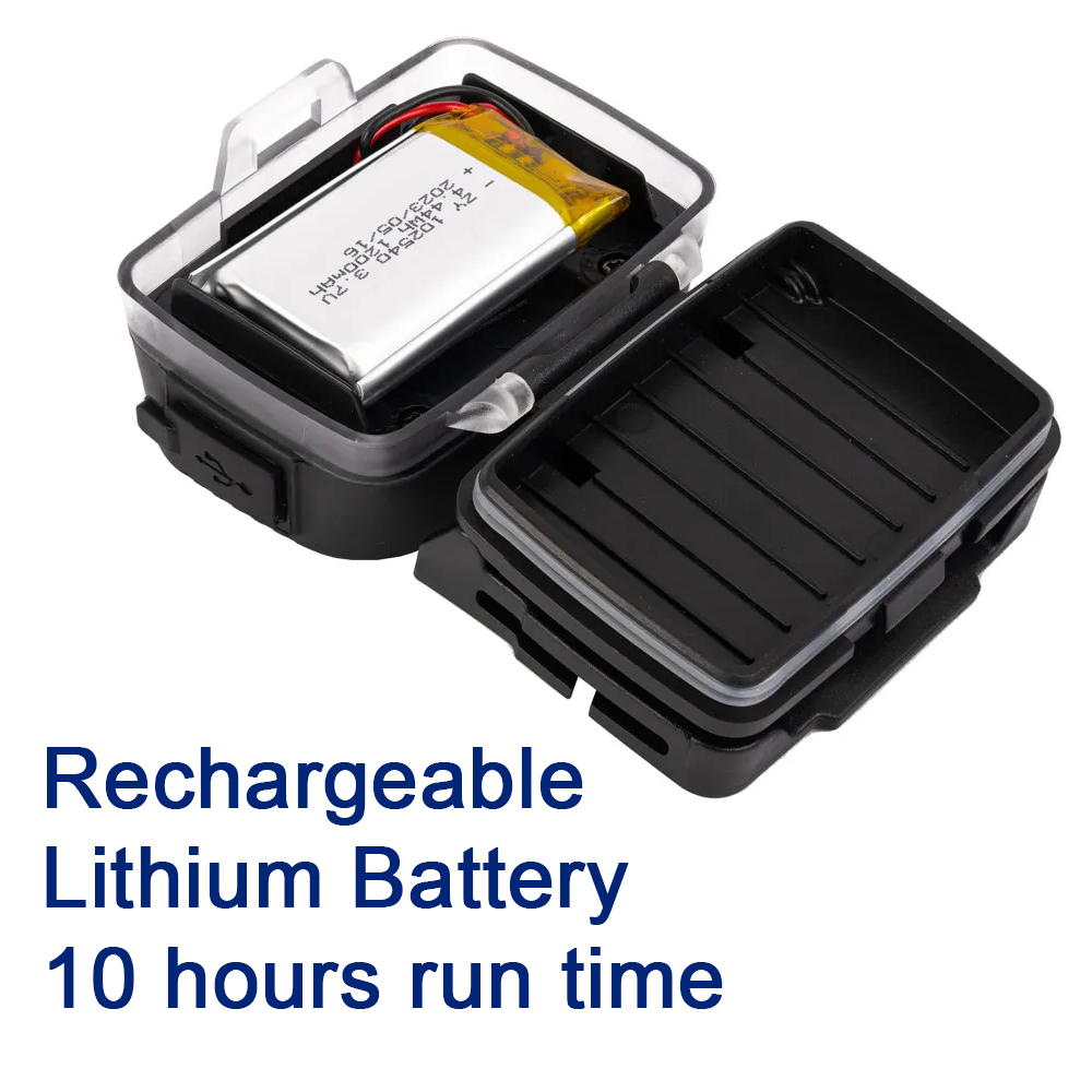 1200mAh lithium battery, that’s rechargeable via the included USB-C cable, and provides up to 2.5 hours runtime between recharges on high, and up to 10 hours on low brightness!