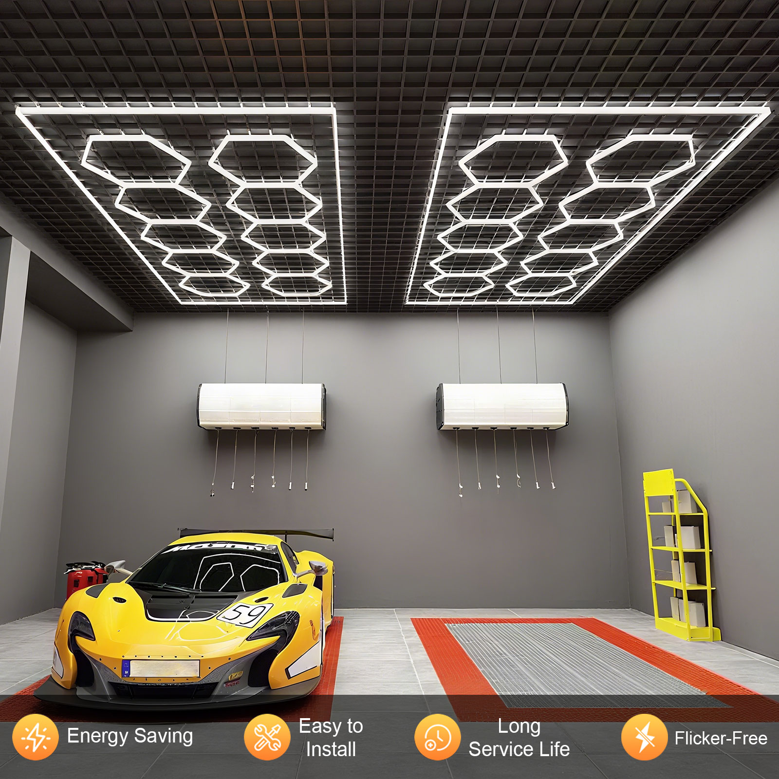 La lampada esagonale a LED da garage è realizzata in policarbonato di alta qualità, noto per la sua durevolezza, resistenza agli urti e elevata trasparenza, ed è completamente isolata per prevenire perdite elettriche. L'utilizzo del policarbonato nella costruzione di questa lampada da garage garantisce la sua resistenza ad ambienti difficili, come quelli dei garage, senza scheggiarsi o rompersi facilmente.