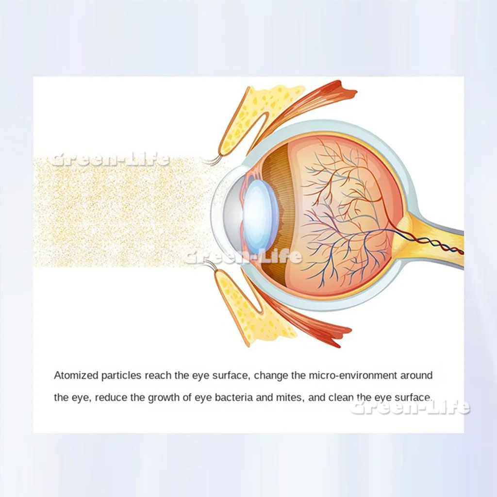 The atomized particles reach the eye surface, improve the micro-environment around the eye, reduce the growth of eye bacteria and mites, and clean the eye surface