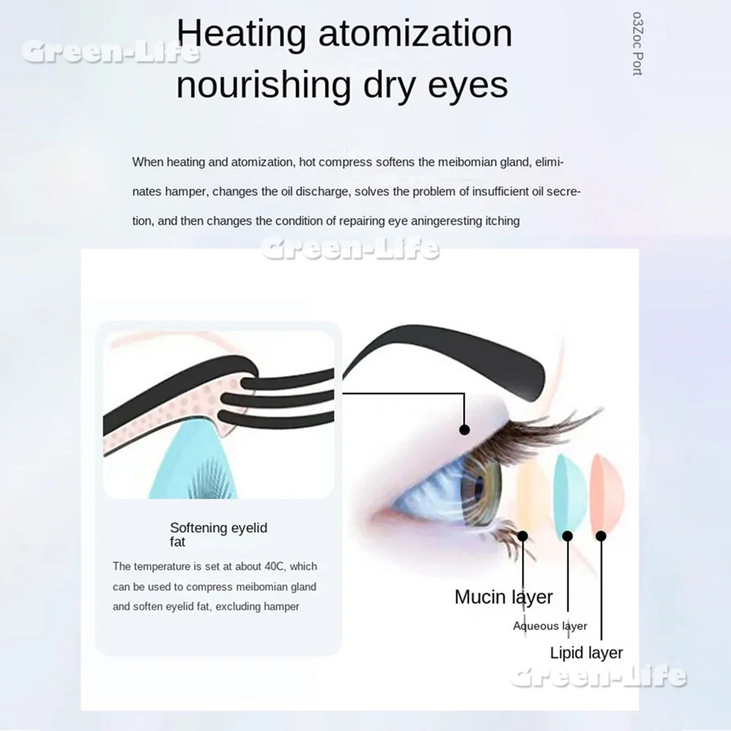During heating and atomization, hot compress softens the meibomian glands, removes obstacles, improves oil discharge, and solves the problem of insufficient oil secretion, thereby improving dry and itchy eyes