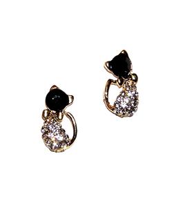 Here's a lovely pair of kitty earrings for you! They are BRAND NEW, and are about 3/8" across and 5/8" tall, with goldtone posts. There are tiny clear rhinestones in the body and a large black rhinestone head all set in goldtone. Very pretty!