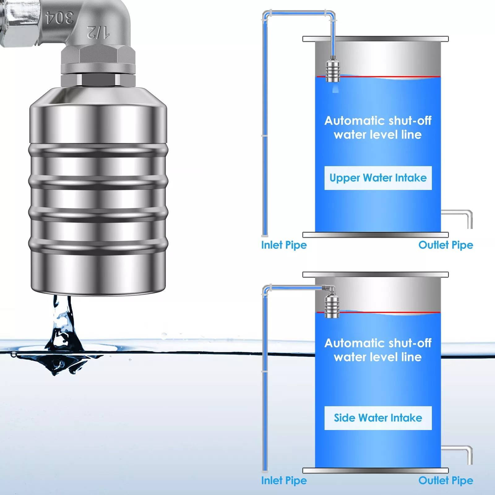 When the water level is lower than the valve level, it will automatically fill your water tank with water. It automatically stops filling once it reaches the valve, so it closes when water reaches the internal float.